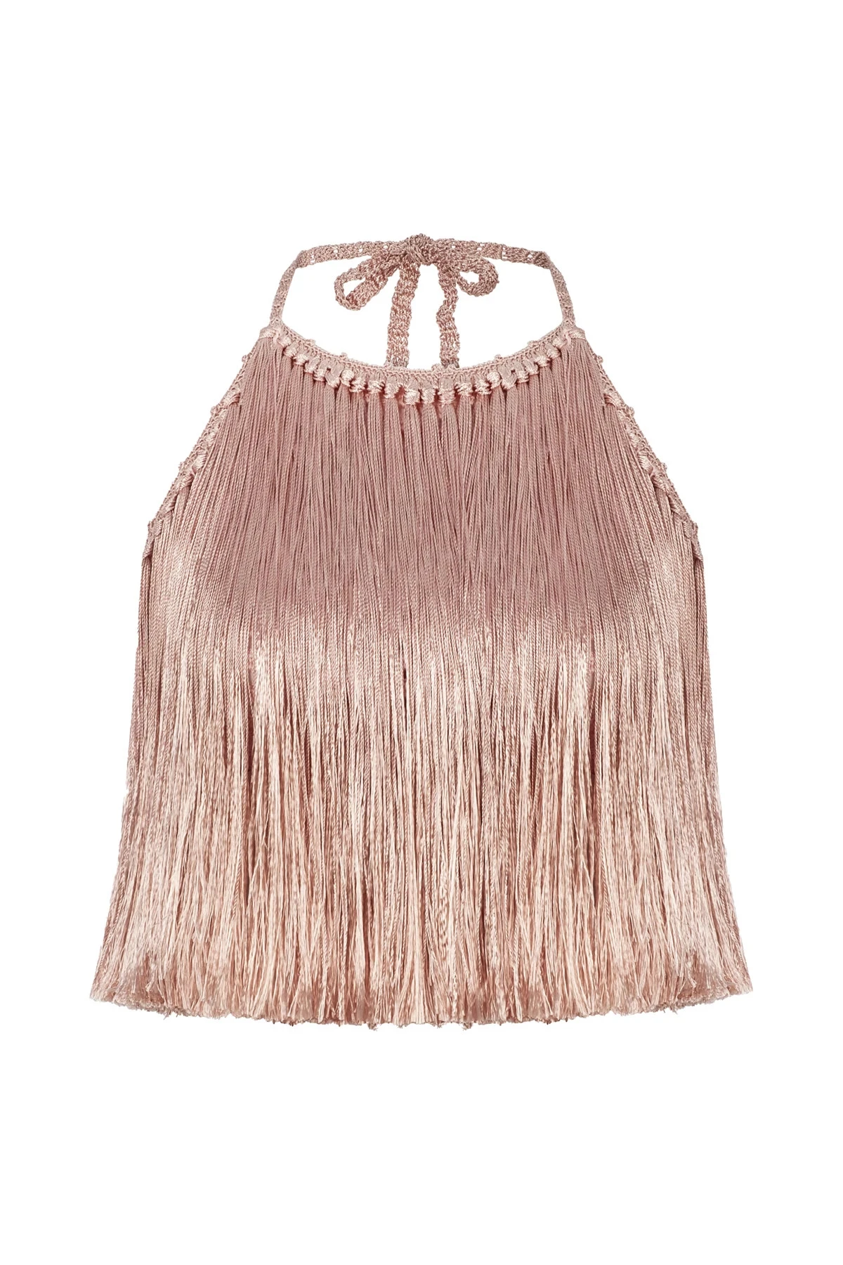Angelica Fringed Halter Top is hand crocheted with silky fringe and an open back.