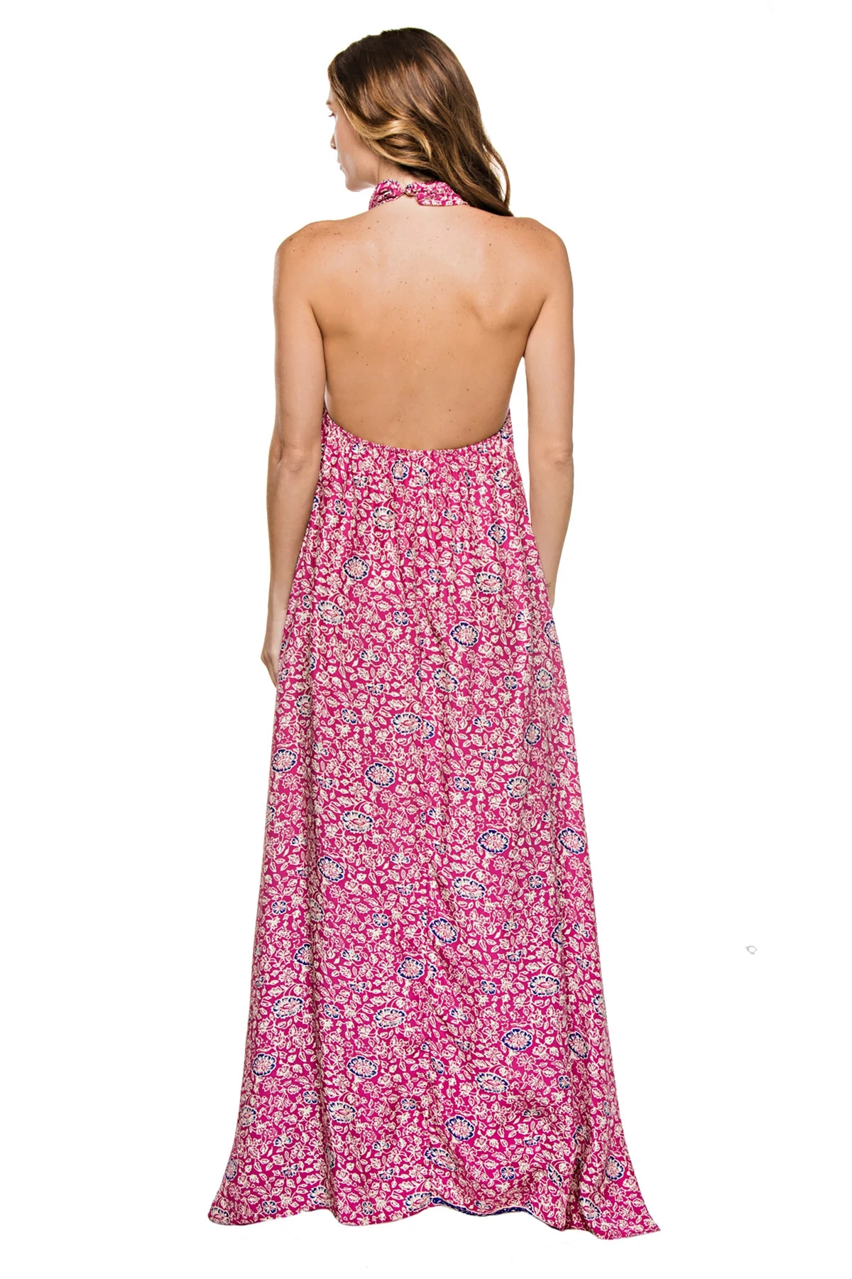 Astrid maxi dress features a floral print with an open back and a halter neck.