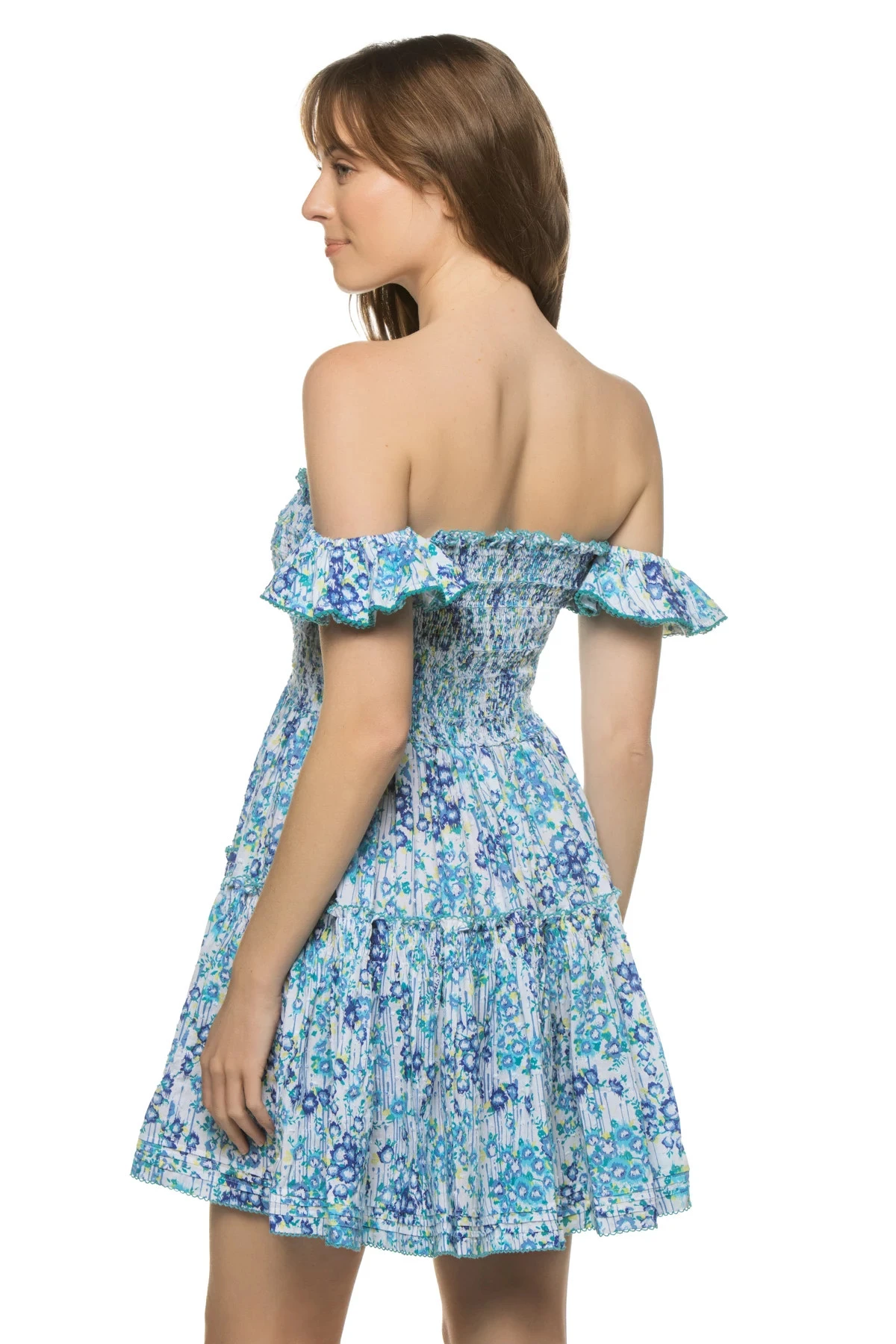 Aurora mini dress features a smocked bodice with off shoulder sleeves and a tiered ruffle skirt.