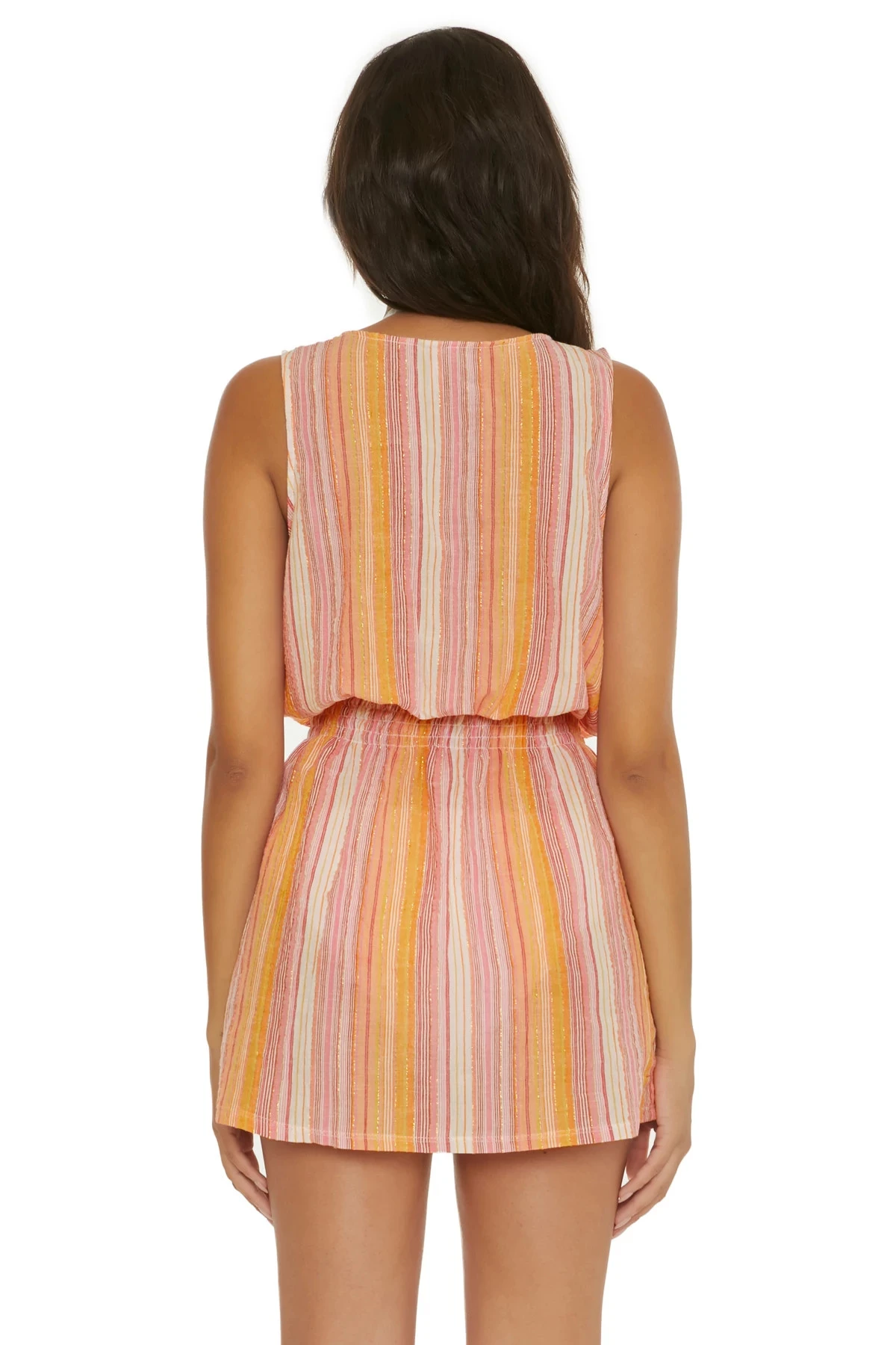 Bella mini dress features a colorful striped metallic print and offers a plunging v-neck with lace up ties, a blouson smocked waist and a relaxed skirt.