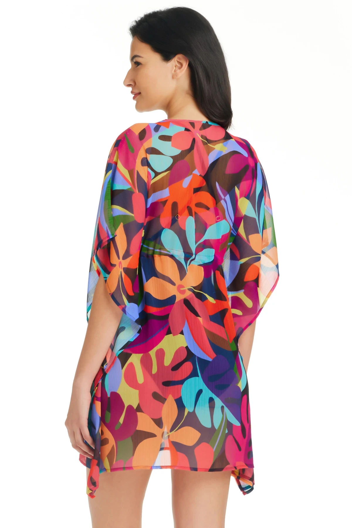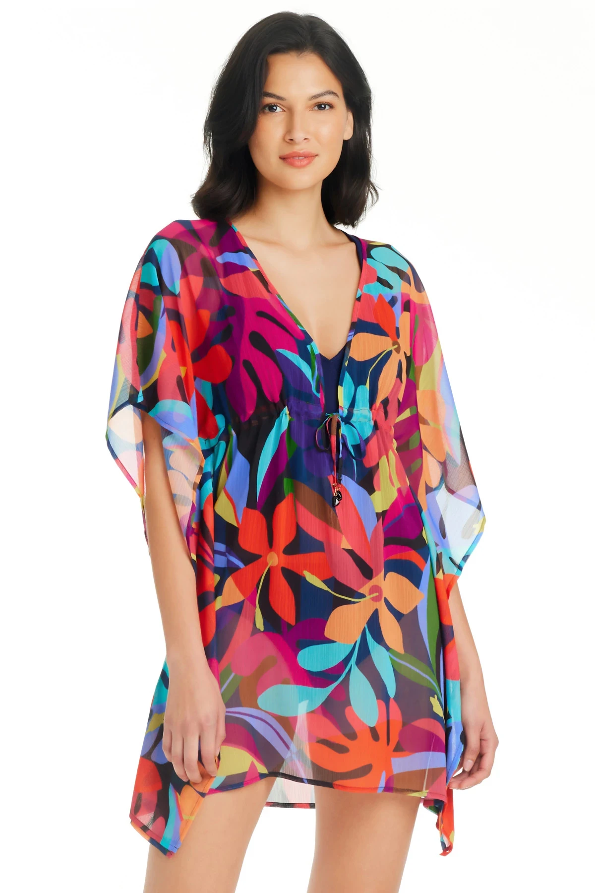 Tunic features a vibrant tropical print with a flattering deep v-neckline, thin adjustable ties and open butterfly sleeves.