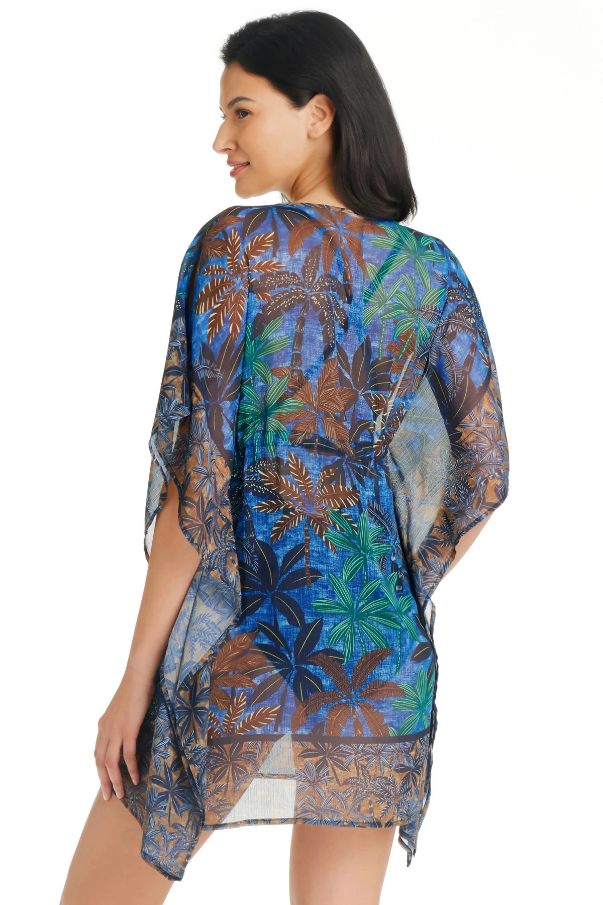 Chiffon tunic features a cool toned tropical print with a flattering deep v-neckline, thin adjustable ties and open butterfly sleeves.