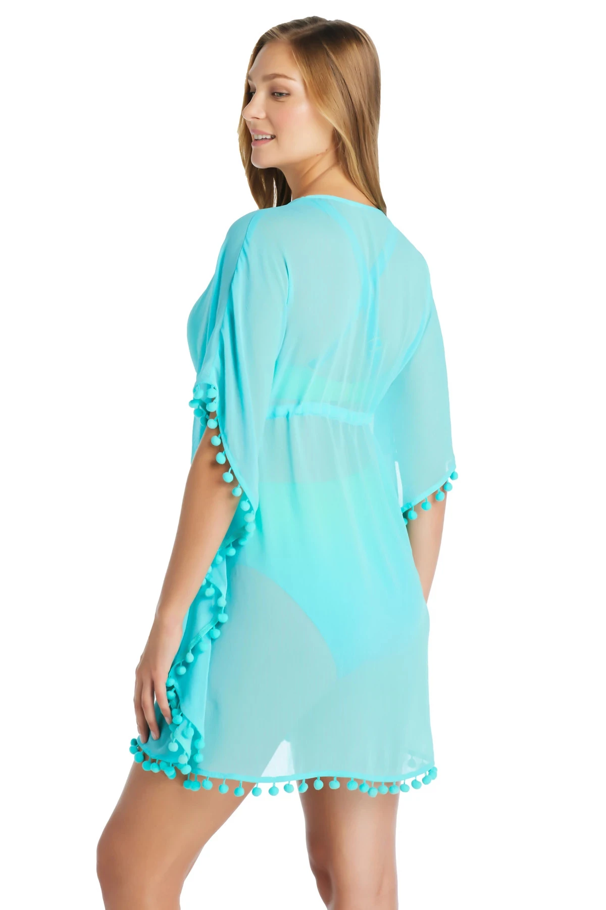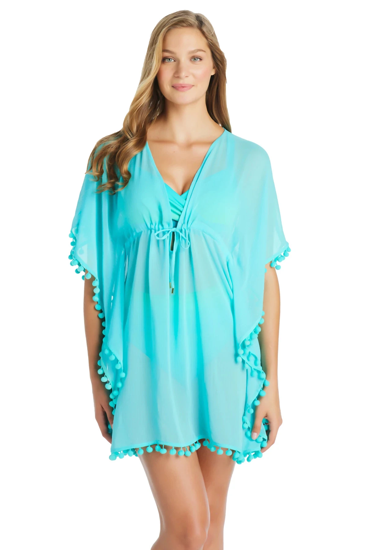 Caftan style tunic featuring a deep and flattering v-neckline with a tie front, open sleeves and pom pom trim.