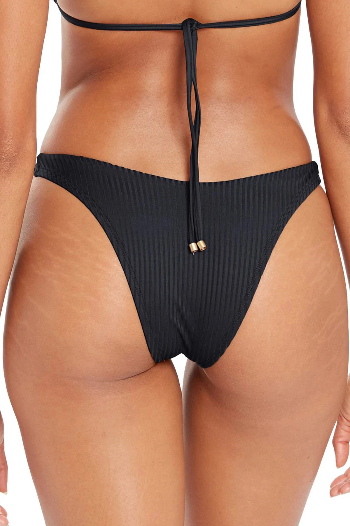 California bikini bottom features a ribbed texture and offers a high leg cut and skimpy coverage.
