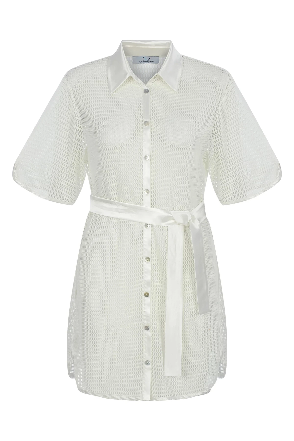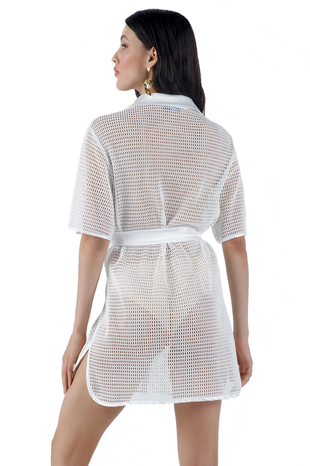 Camila mini dress features a open weave bodice with a collared neckline and button closure. Offers a removable tie belt.