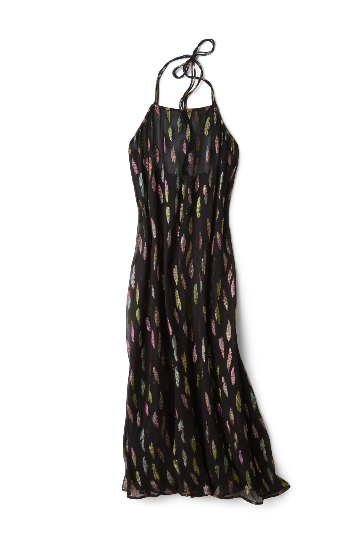 Chantel Dress features a multicolor metallic print with ties around the neck and a low back.