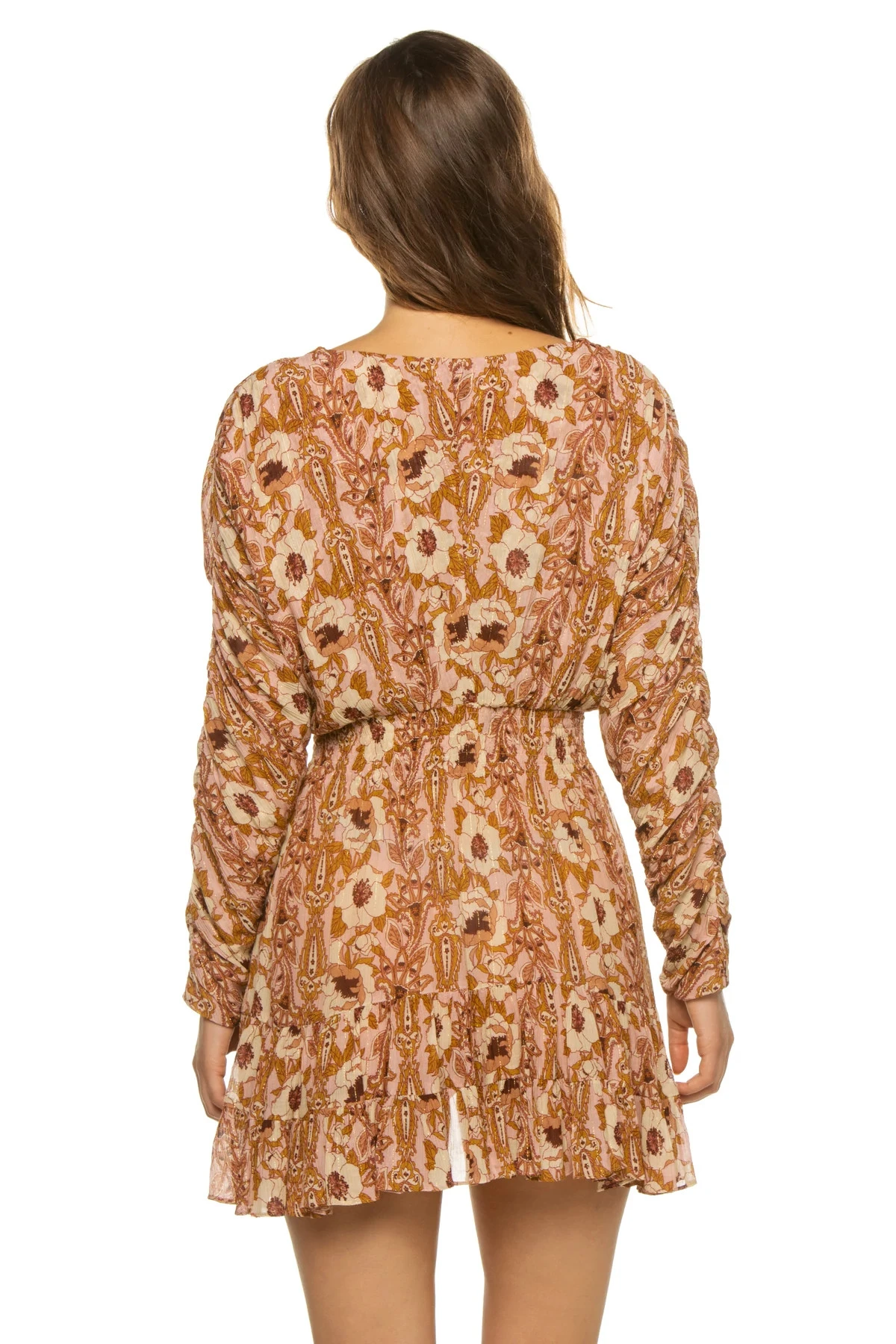 Chiara mini dress features floral print with a flattering v-neckline with a smocked elastic waistline and lightly ruffled hem.