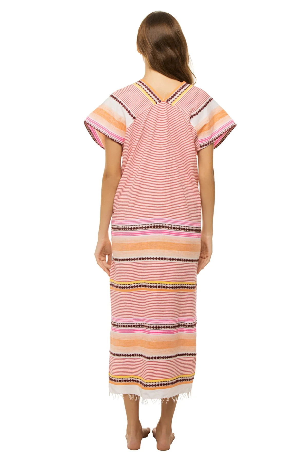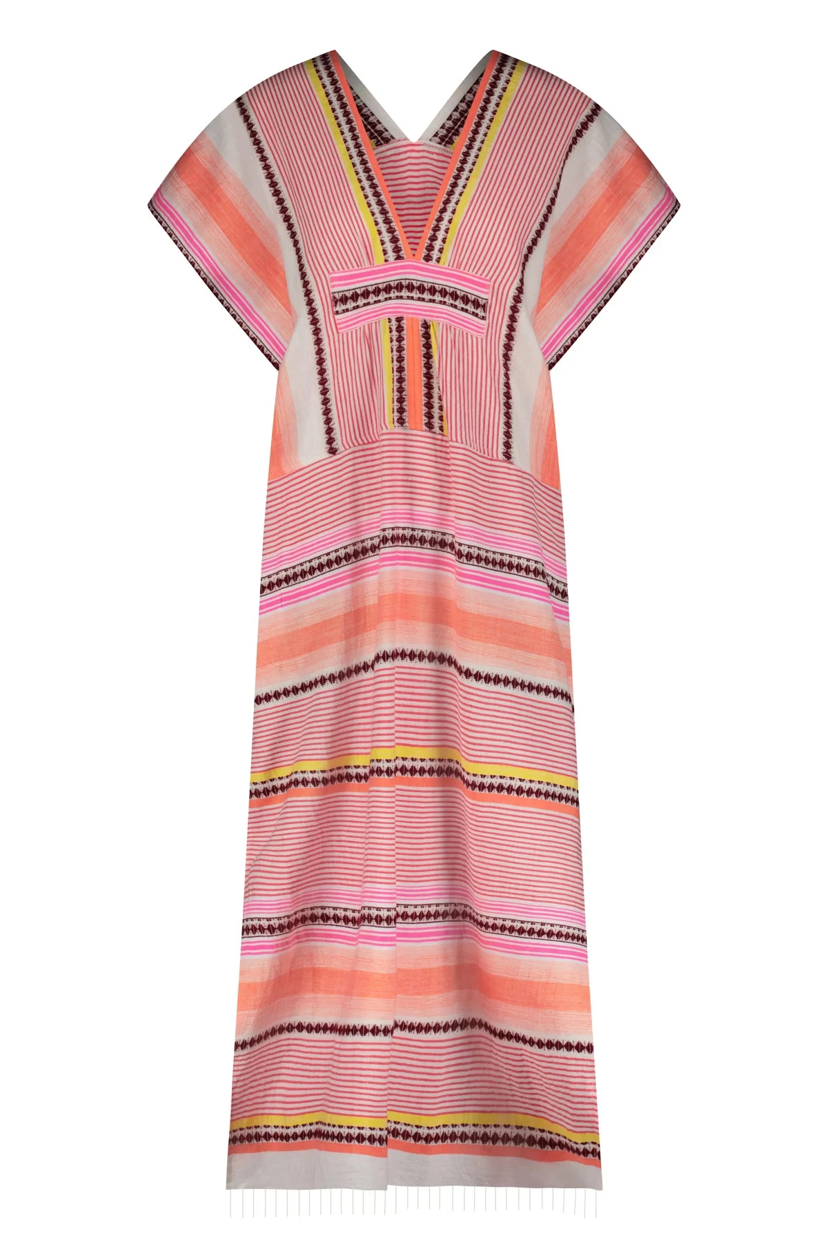 Cirq midi dress features intricate stripes and rich Tibeb pattern made by the most skilled artisans. Offers a v-neckline, short sleeves and a raw fringe hem.