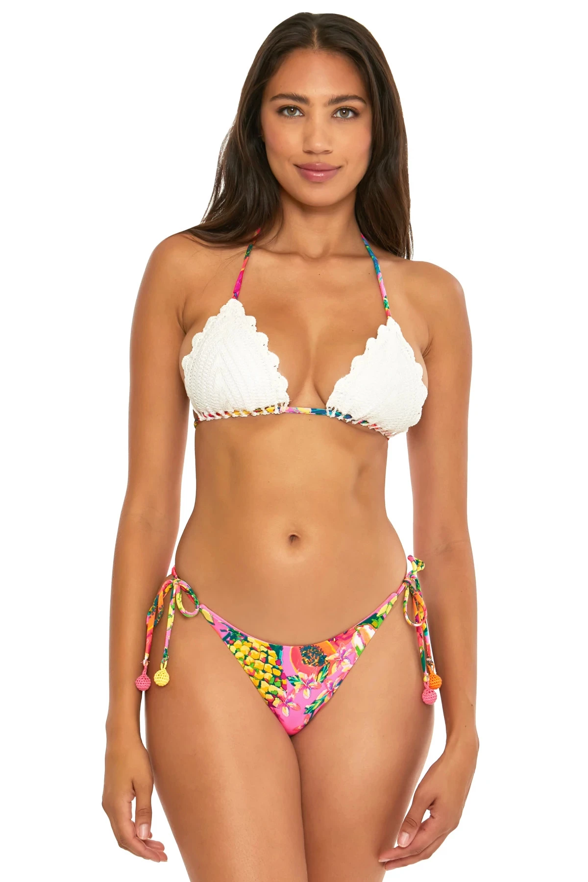 Triangle bikini top features a vibrant tropical print that reverses to a beautiful hand crafted crochet. Offers removable soft cups and adjustable neck and back ties with bead details.