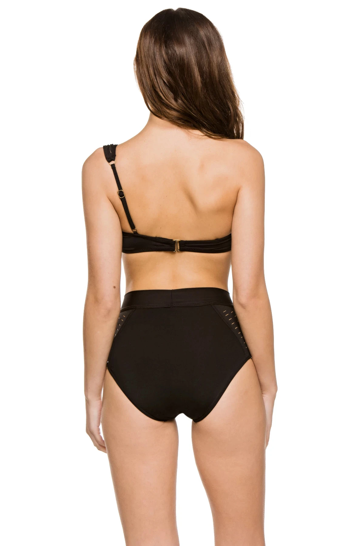 One shoulder bikini top features laser cutout insets and removable cups and offers an adjustable shoulder strap with a hook back closure.