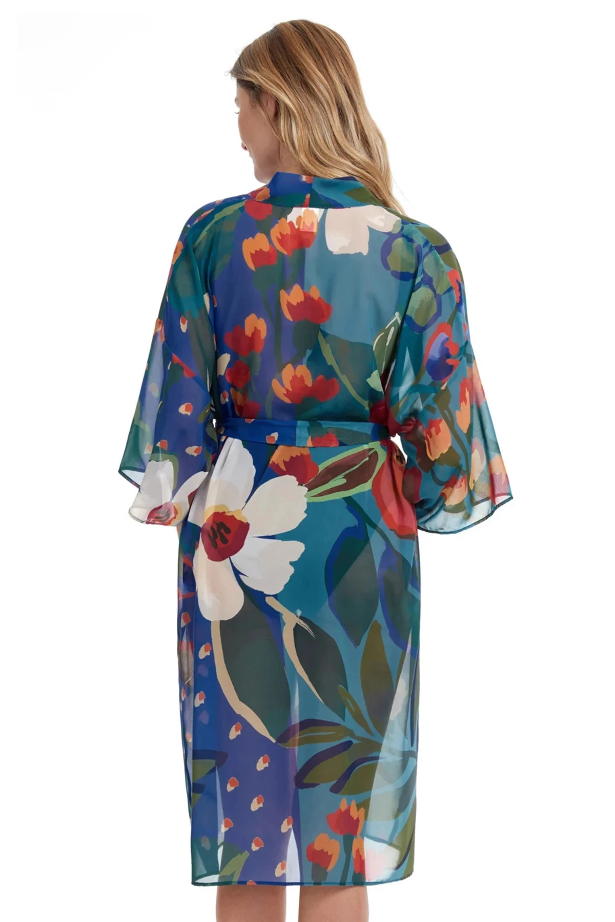 Kimono features three quarter sleeves and a deep v-neck that offers ties at waist.