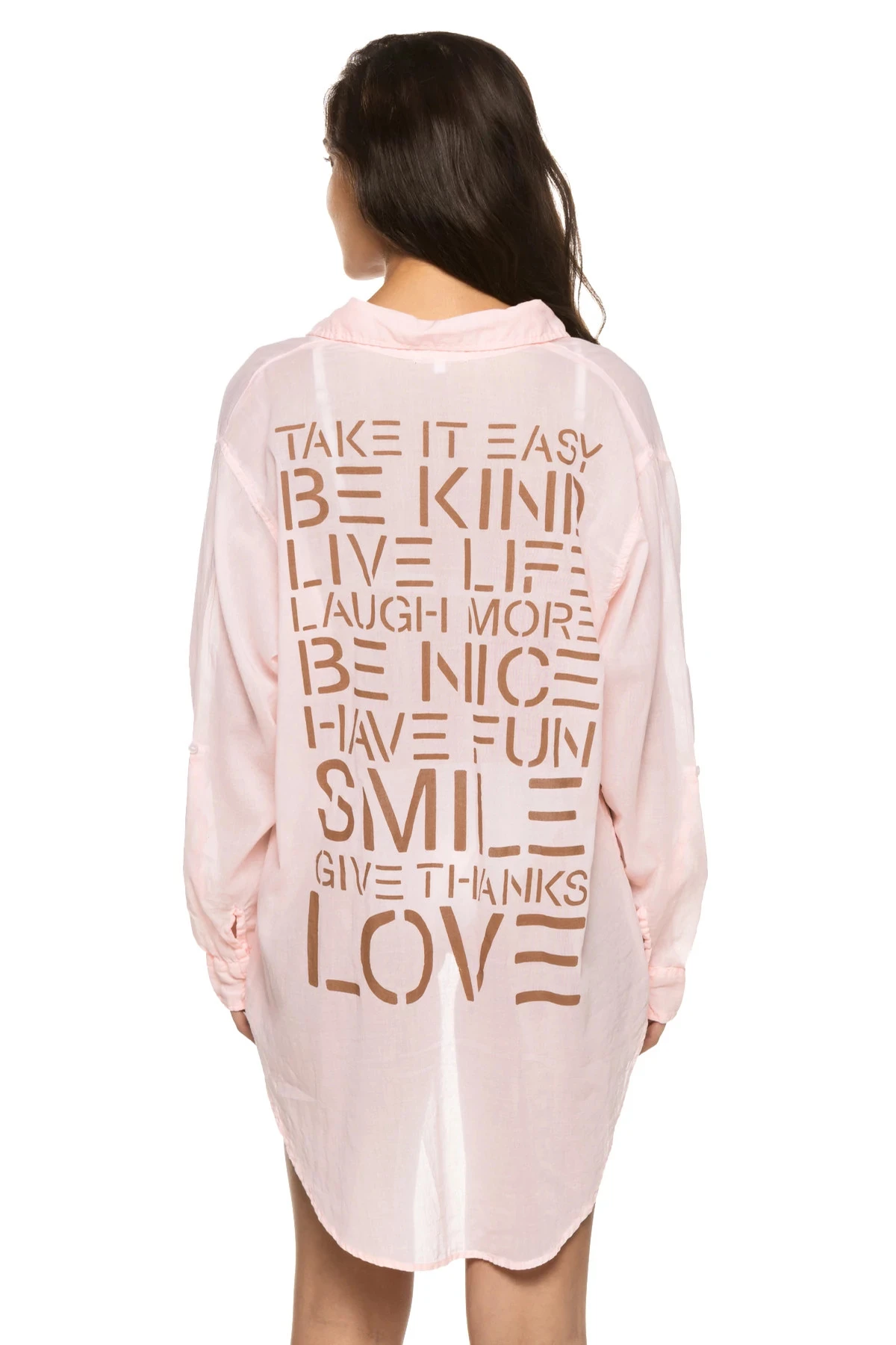 Shirt dress features a graphic back and a hi-low hem and offers an oversized fit and button up front.