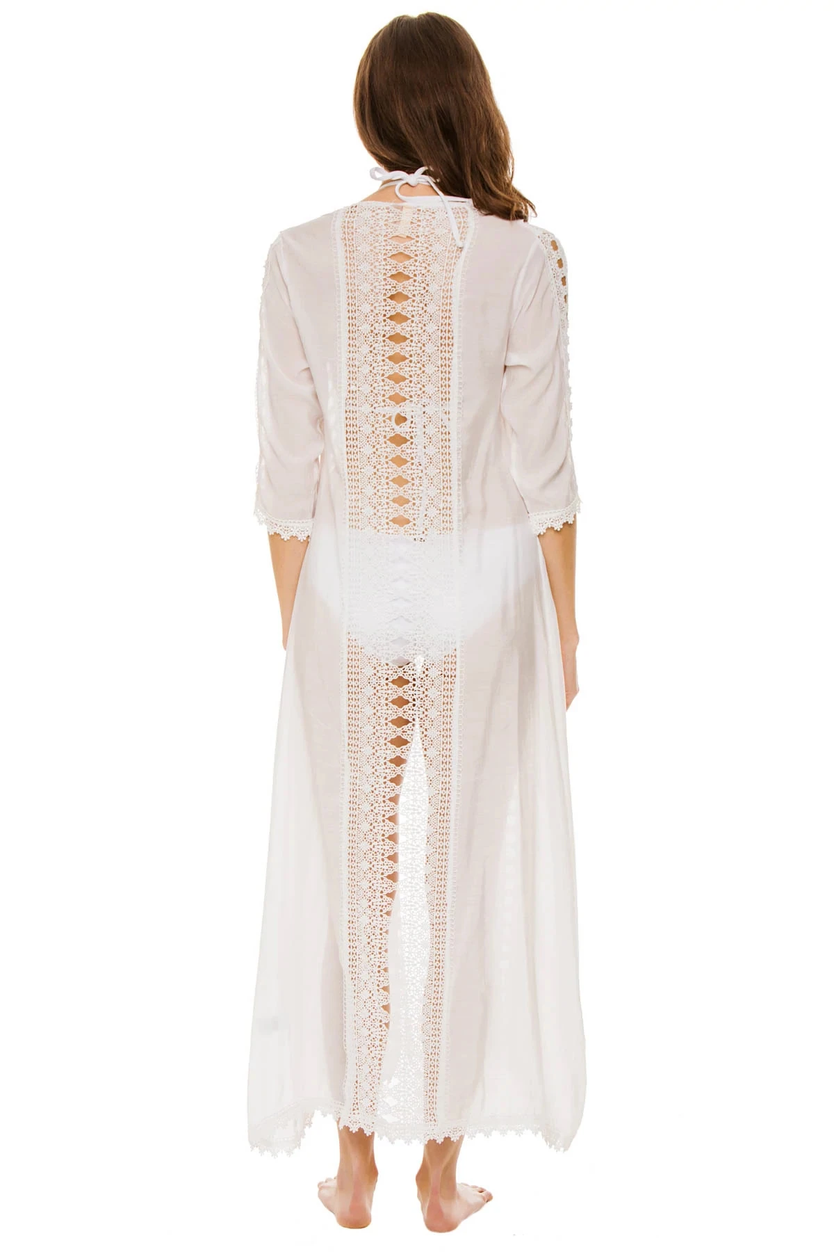 Cover kimono features crochet insets with front pockets, half sleeves, and tie front closure.