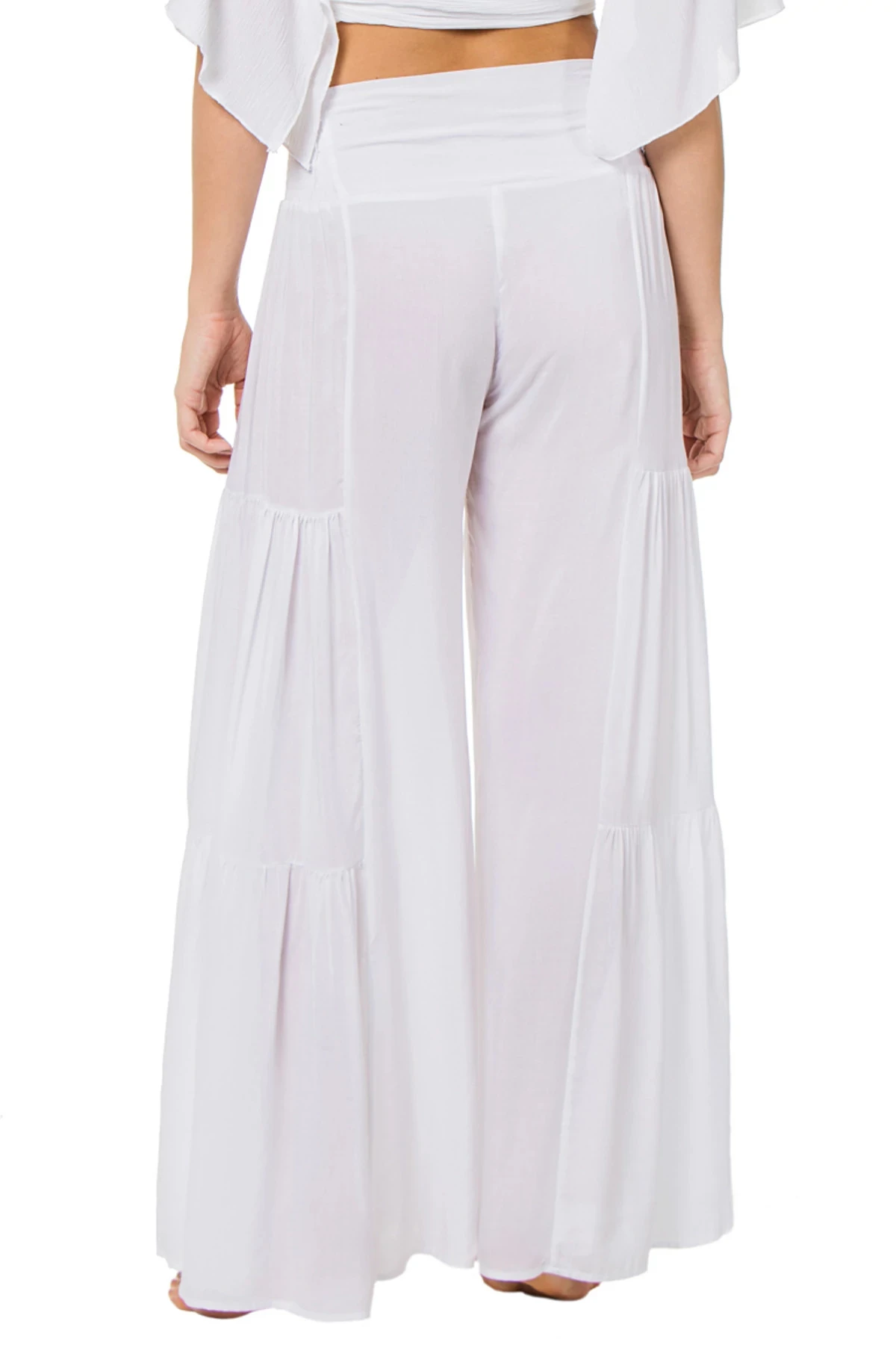 Wide leg tiered pants with oversize bow tie at waist and smocked panels.
