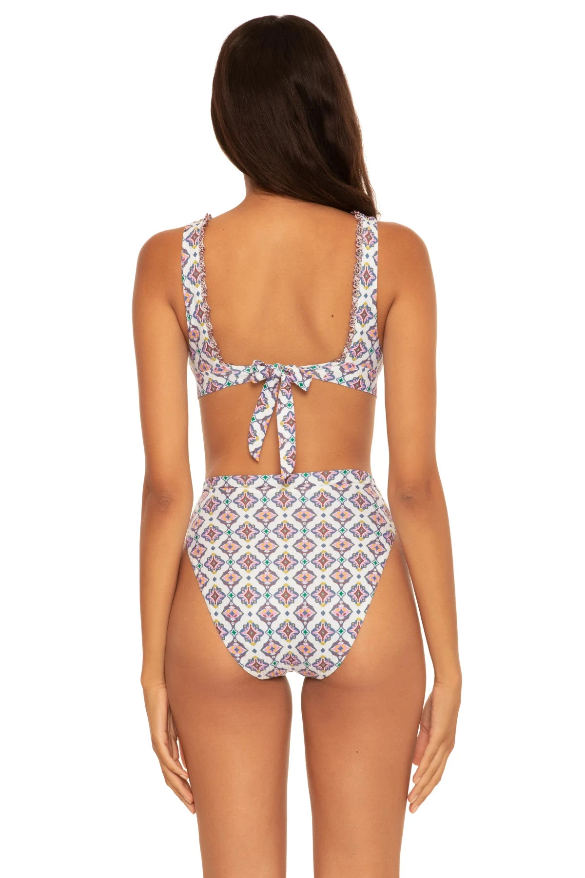Elliana triangle bikini top features a textured rib fabrication with a medallion print and offers a supportive under bust band and adjustable back ties.