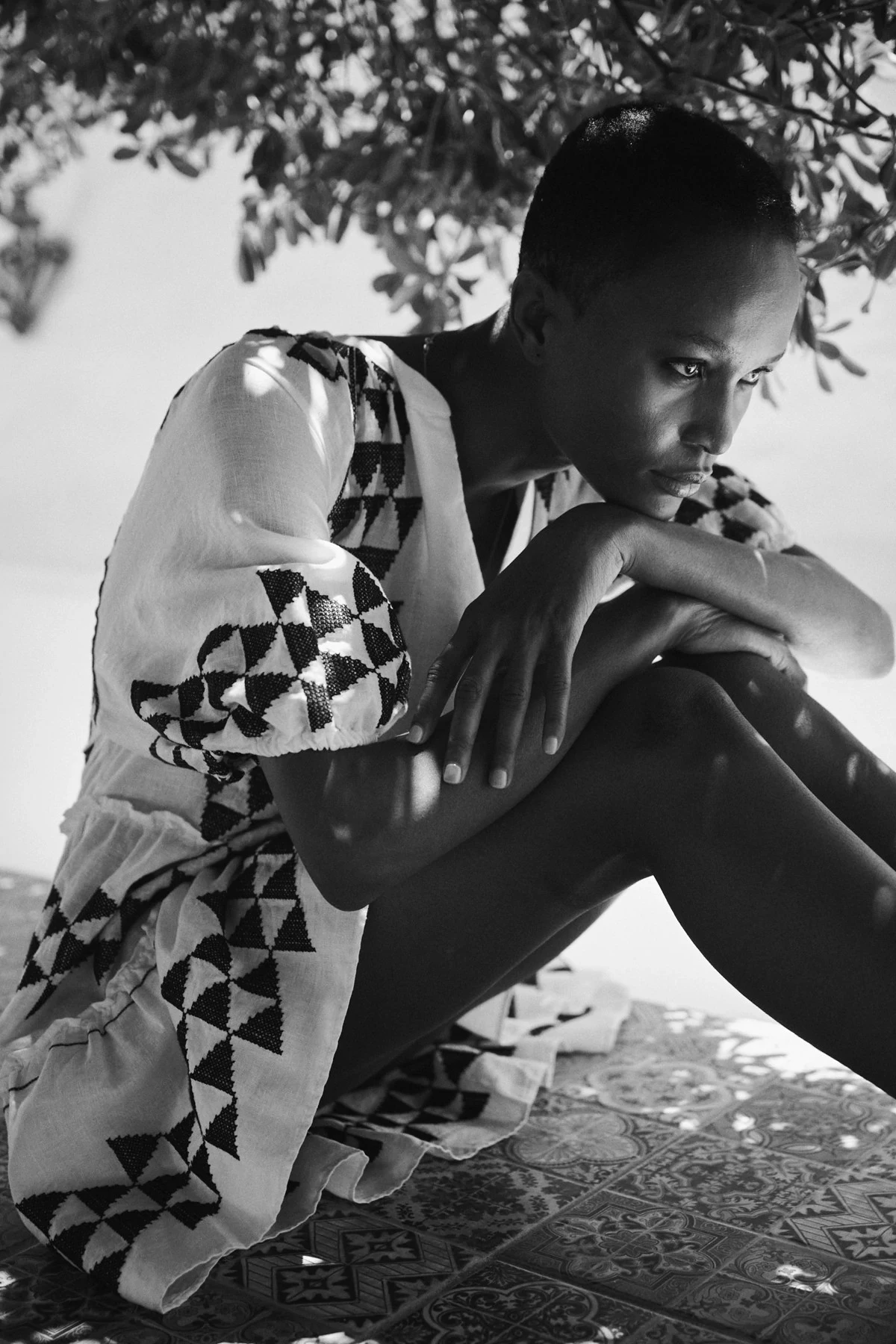Mini dress features a split neckline with short puff sleeves and a tiered ruffle skirt with embroidered detail.