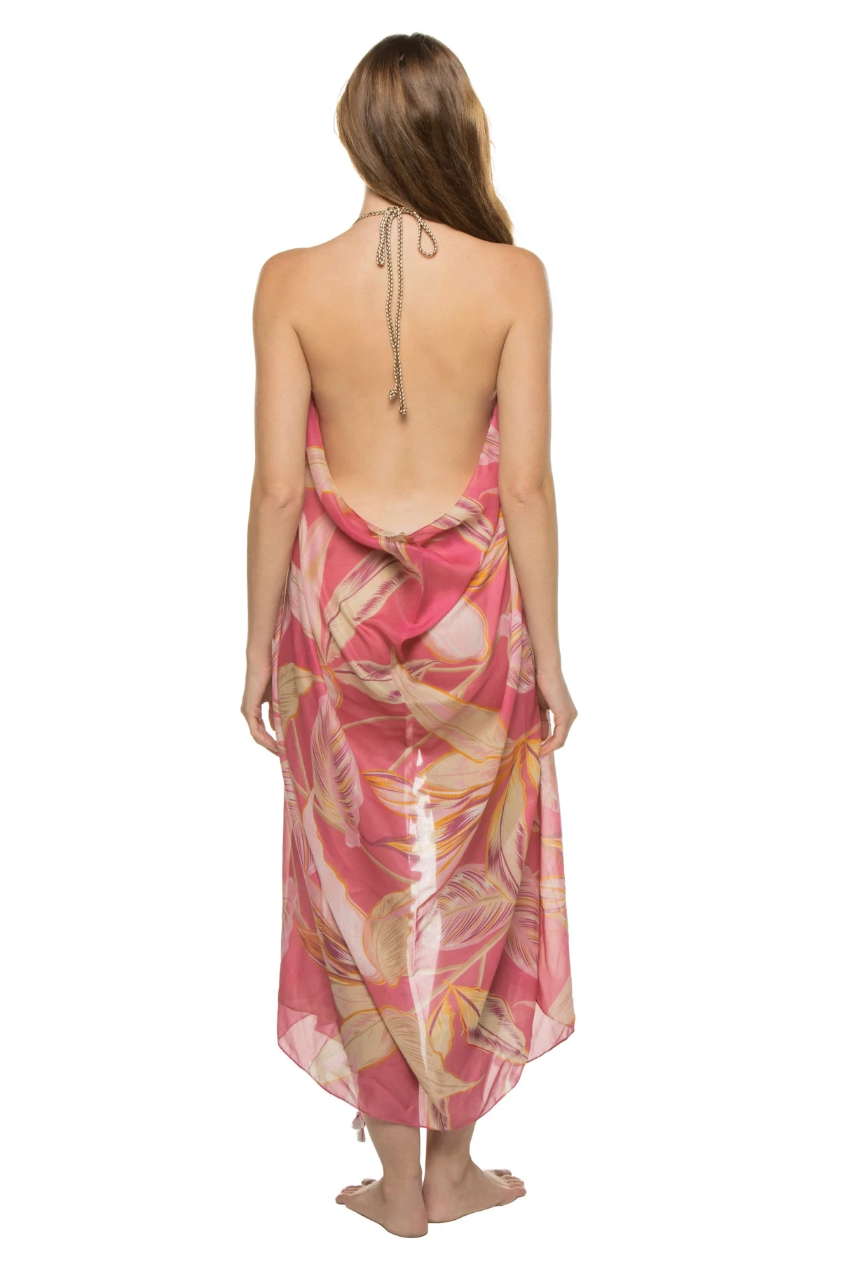 Escape from paradise midi dress features a floral print with decorative tassels and offers adjustable halter ties.