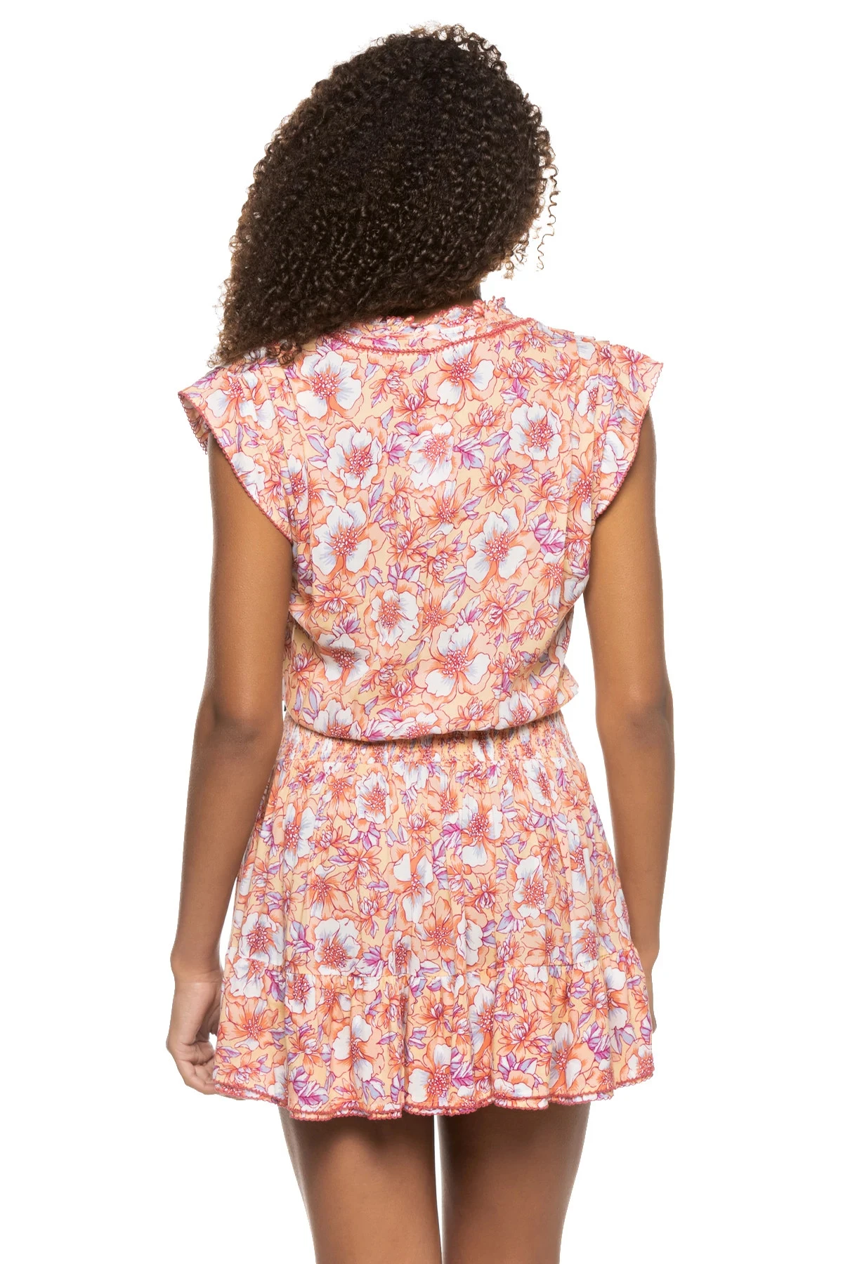 Estelle mini dress features a v-neckline with square cut sleeves and a wrap effect skirt finished with flirty ruffles and a smocked back waist.