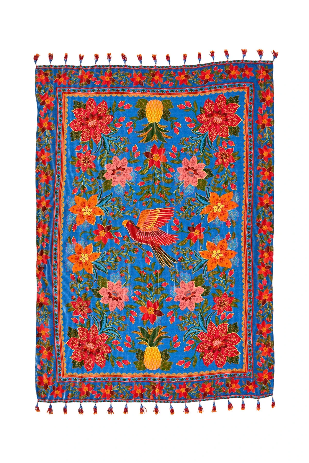 Blue tropical tapestry sarong features metallic lurex threading with a colorful tassel hem.