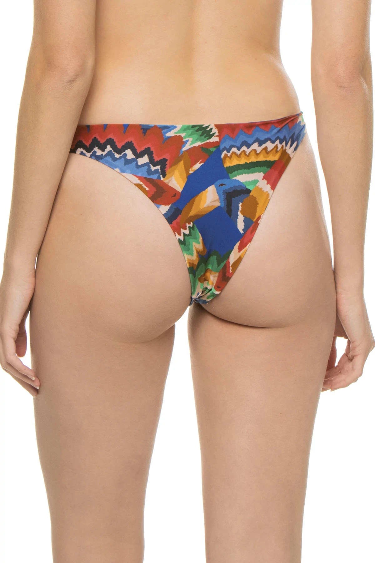 Chevron toucans brazilian bikini bottom features a unique print and offers minimal coverage with a high leg cut.