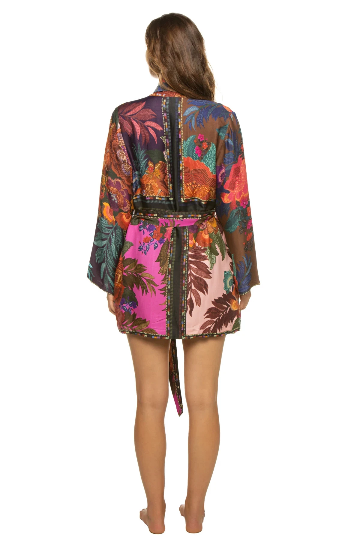 Flower Scarves Kimono is a luxuriously elegant cover up featuring long, relaxed sleeves with a collared neckline and an adjustable tie at waist.