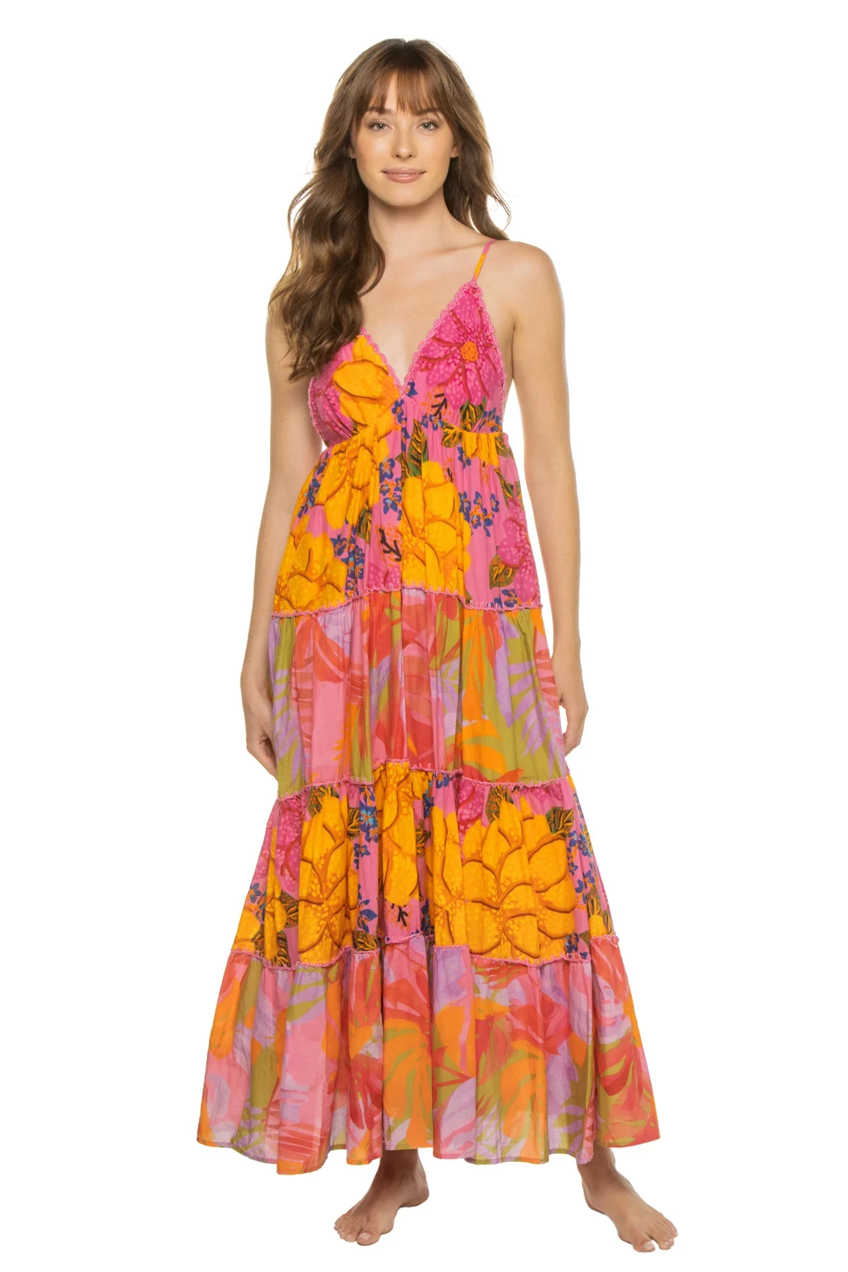 Flowers garden maxi dress features a gorgeous floral print with detailed crochet trim and a tiered skirt. Offers a v-neckline and adjustable straps.