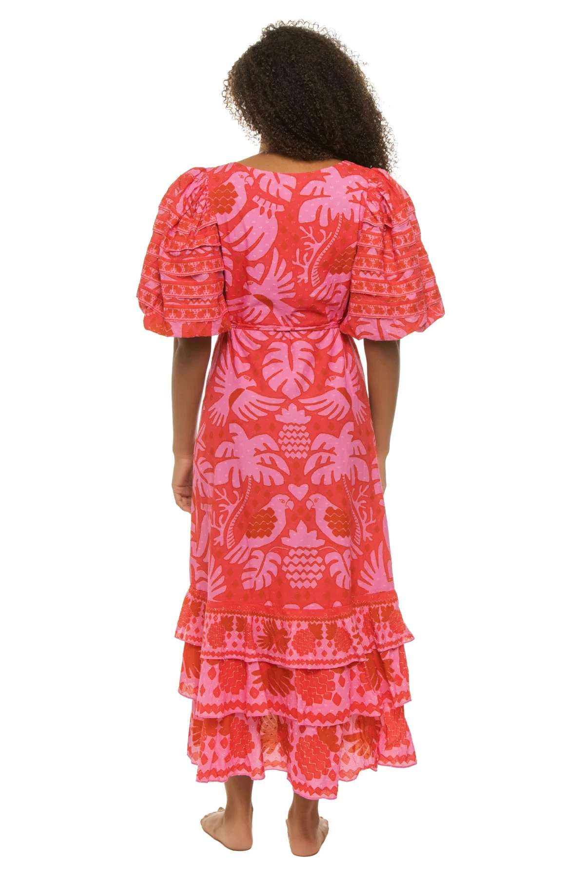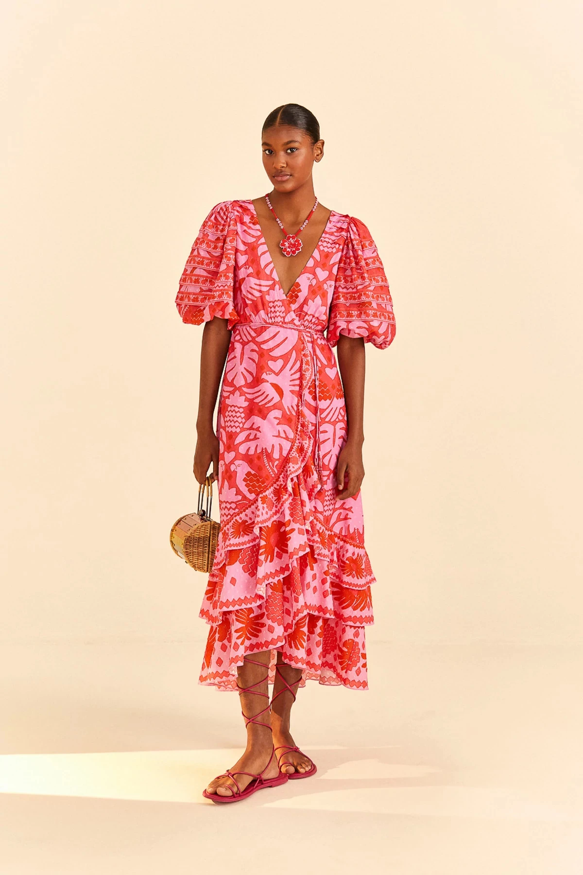 Jungle scarf midi dress features a tropical print with puff sleeves. Offers a plunging wrap neckline and a tiered ruffle skirt with beaded tassel ties.