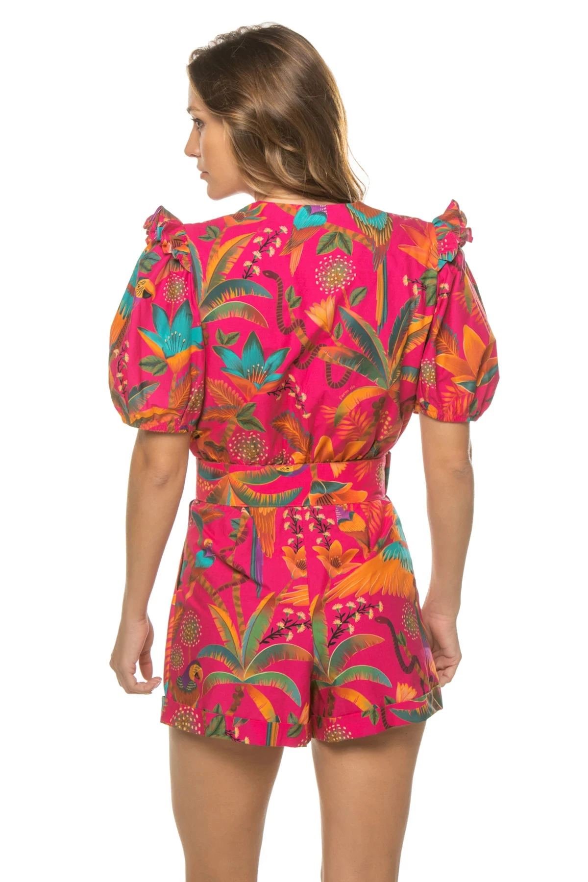 Macaw party romper features an extravagant print with ruffled puff sleeves and an adjustable belt.