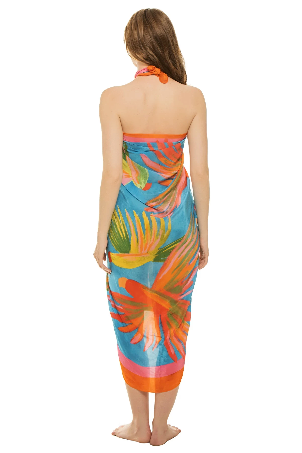 Painted Birds sarong features a tropical print and offers a variety of wear options with self ties at waist