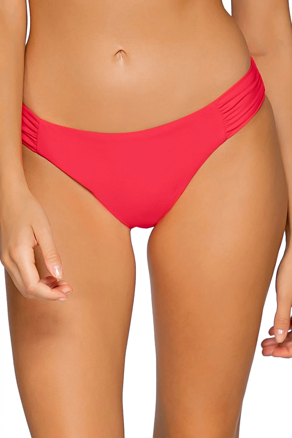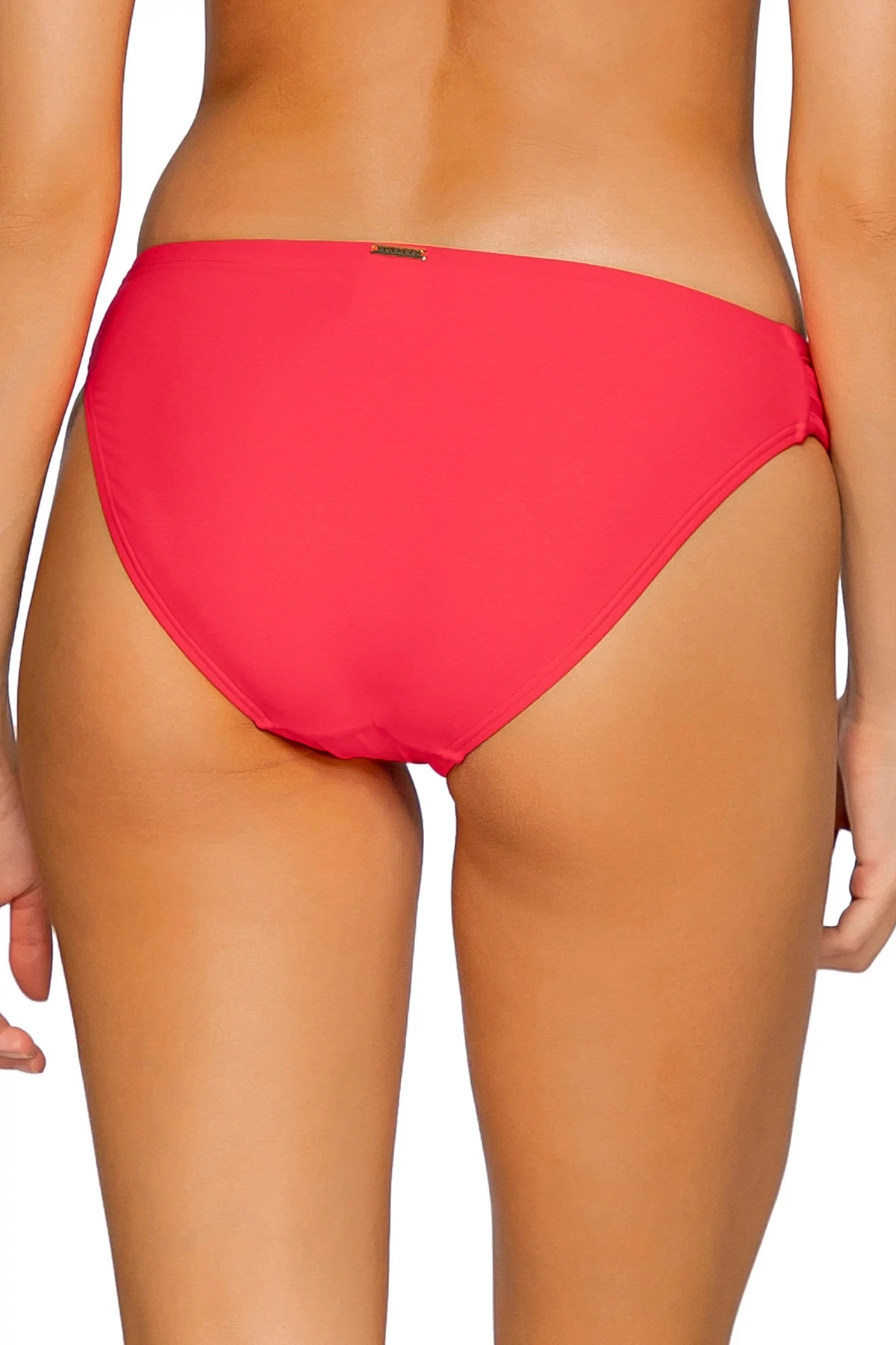 Perfect for the woman who wants a classic bottom, but wants to camouflage certain areas. The side shirring looks flattering on the hips and the soft tab sides avoid any unwanted pressure on the hips. Features include self lined front and back matching colored lining. Sits straight across the hip.