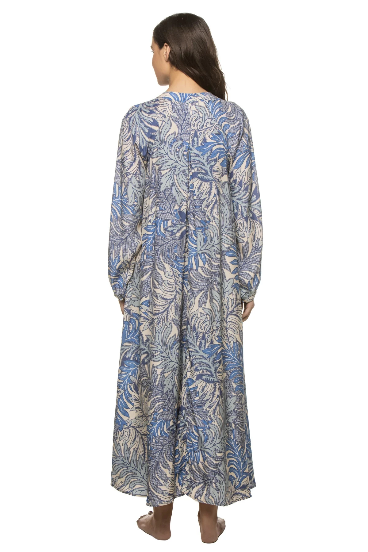 Fiore A-line maxi dress features v-neckline with covered buttons and voluminous long sleeves.