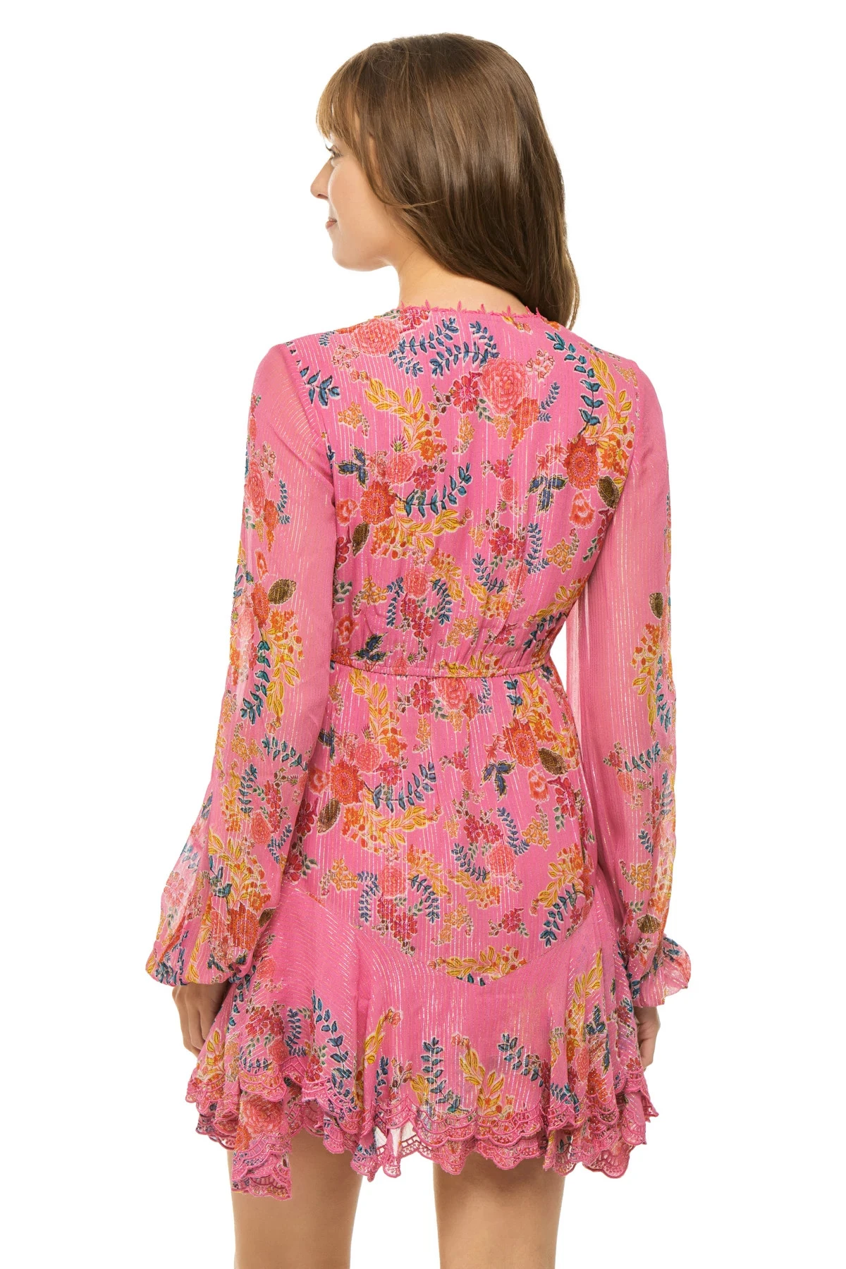 Floral mini dress features a v-neckline with trim detail, decorative front buttons, long billowing sleeves and a flounce hem skirt.