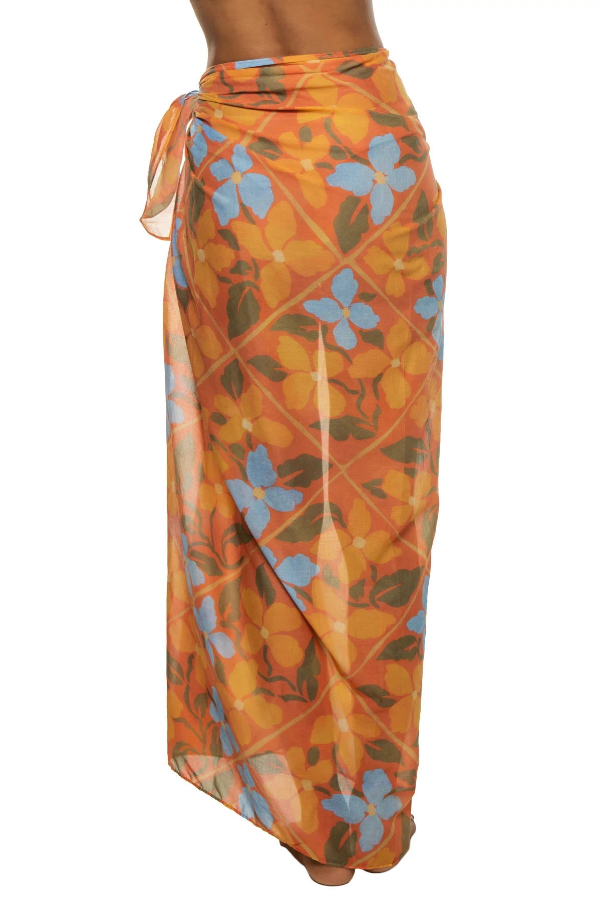 Floreale sarong features a hand painted floral tile design inspired by vintage Italian ceramics. Offers a a straight fit skirt with an open front split, fully adjustable for the perfect fit.