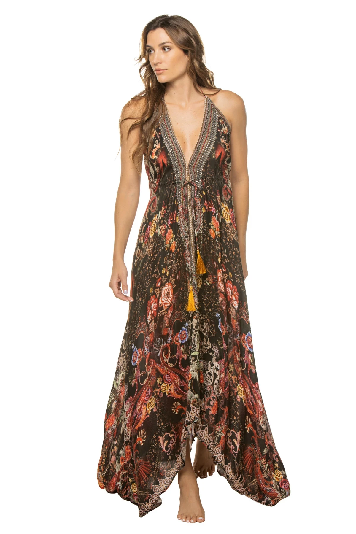 Forest Festival midi dress features an ultra flowy silhouette with a plunging neckline and open back that offers adjustable tassel ties.