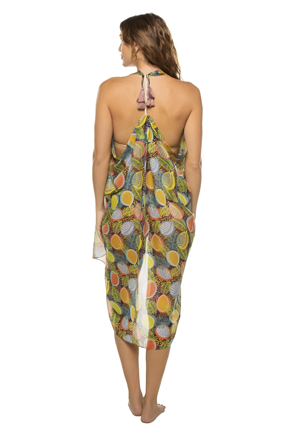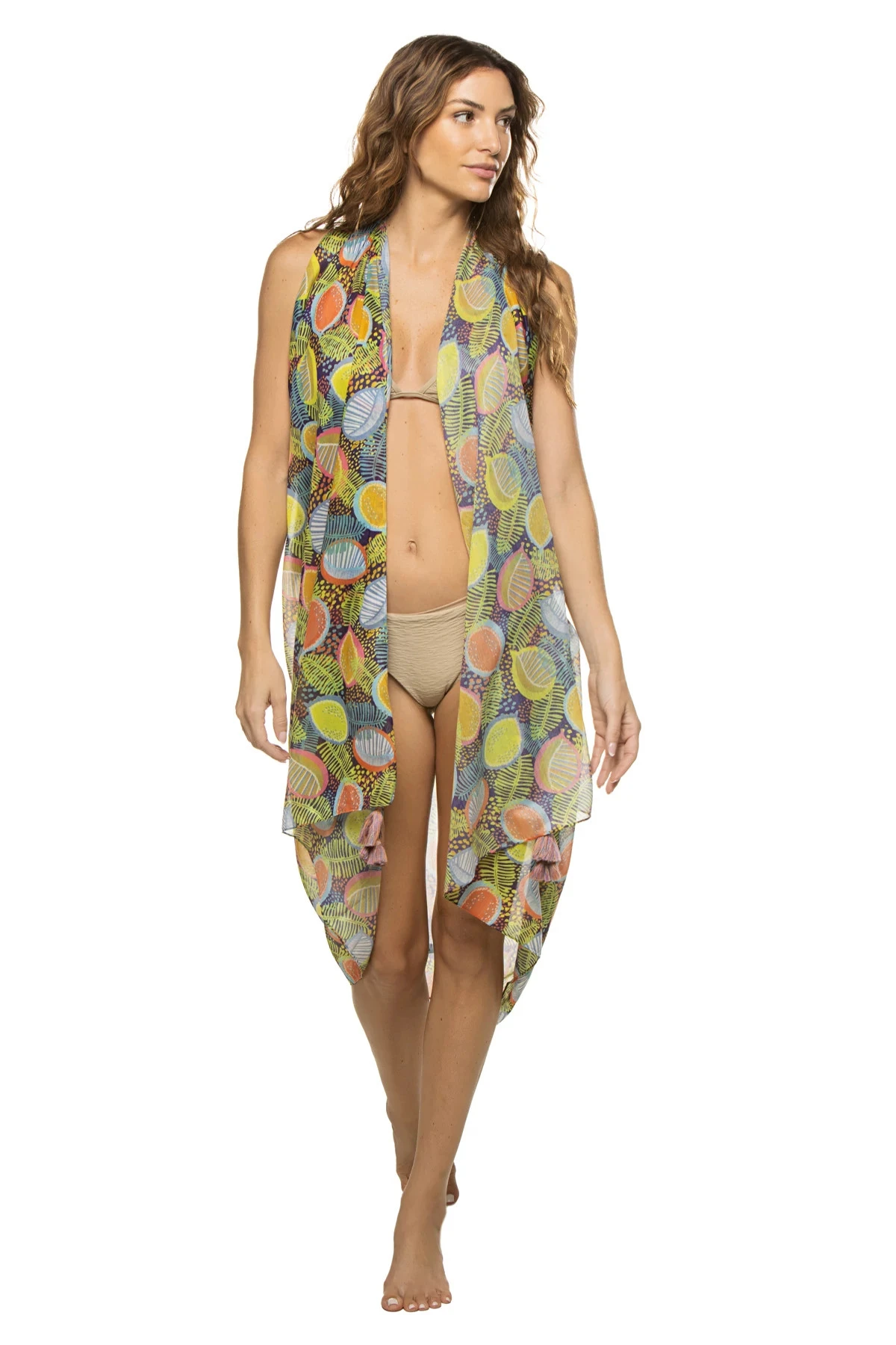 Guava chic kimono features a sheer design with a T-back strap and can be worn in a variety of ways. Offers a sleeveless fit and full open front.