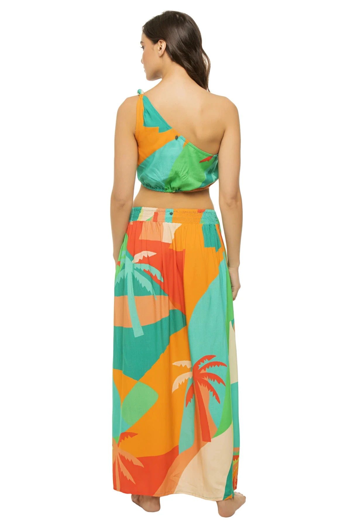 Hali crop top features a tropical print with an asymmetrical neckline and offers an elastic hem.