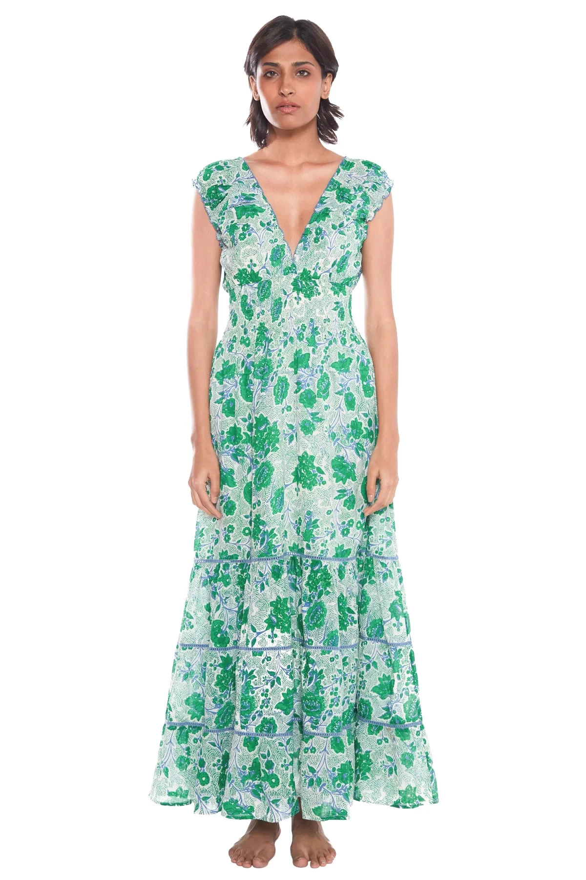 Hilda maxi dress features a beautiful ditsy floral print with v-neckline, cap sleeves, smocked waistband, and tiered skirt.