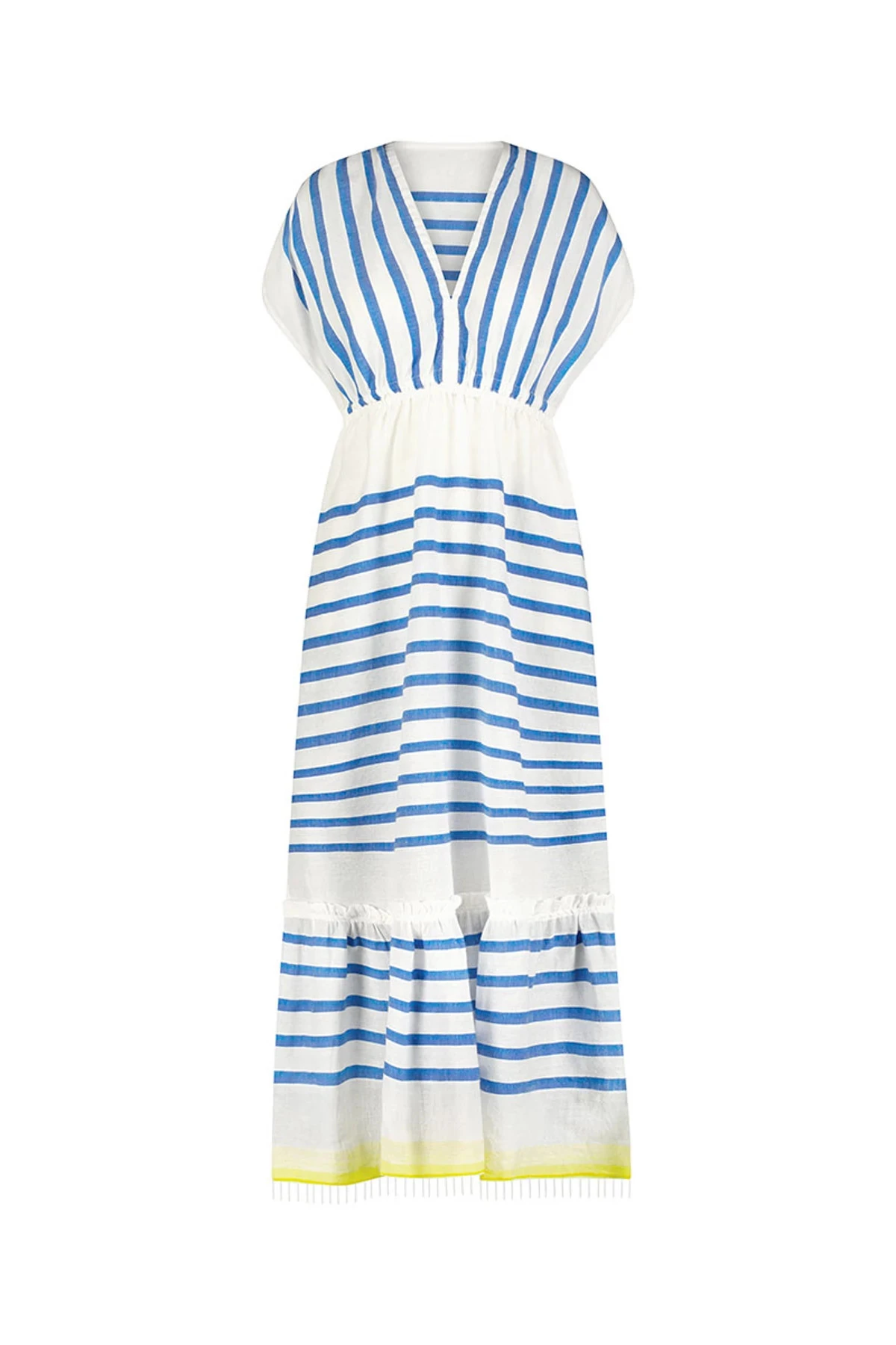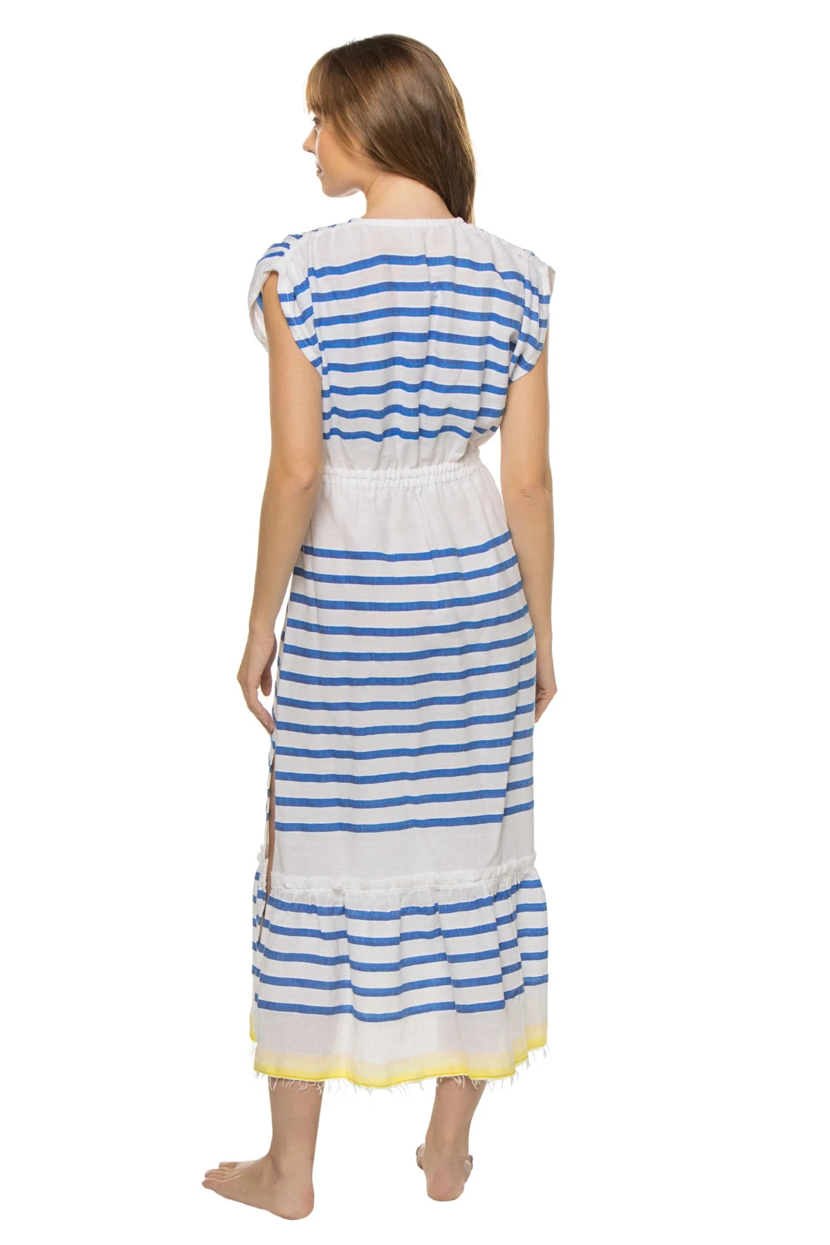 Hirut maxi dress is hand woven in super-soft hand spun cotton featuring a v-neckline and offers diaphanous dolman sleeves that help create an hourglass silhouette that gathers into a comfortable elastic waist, side slits and a ruffle hem.