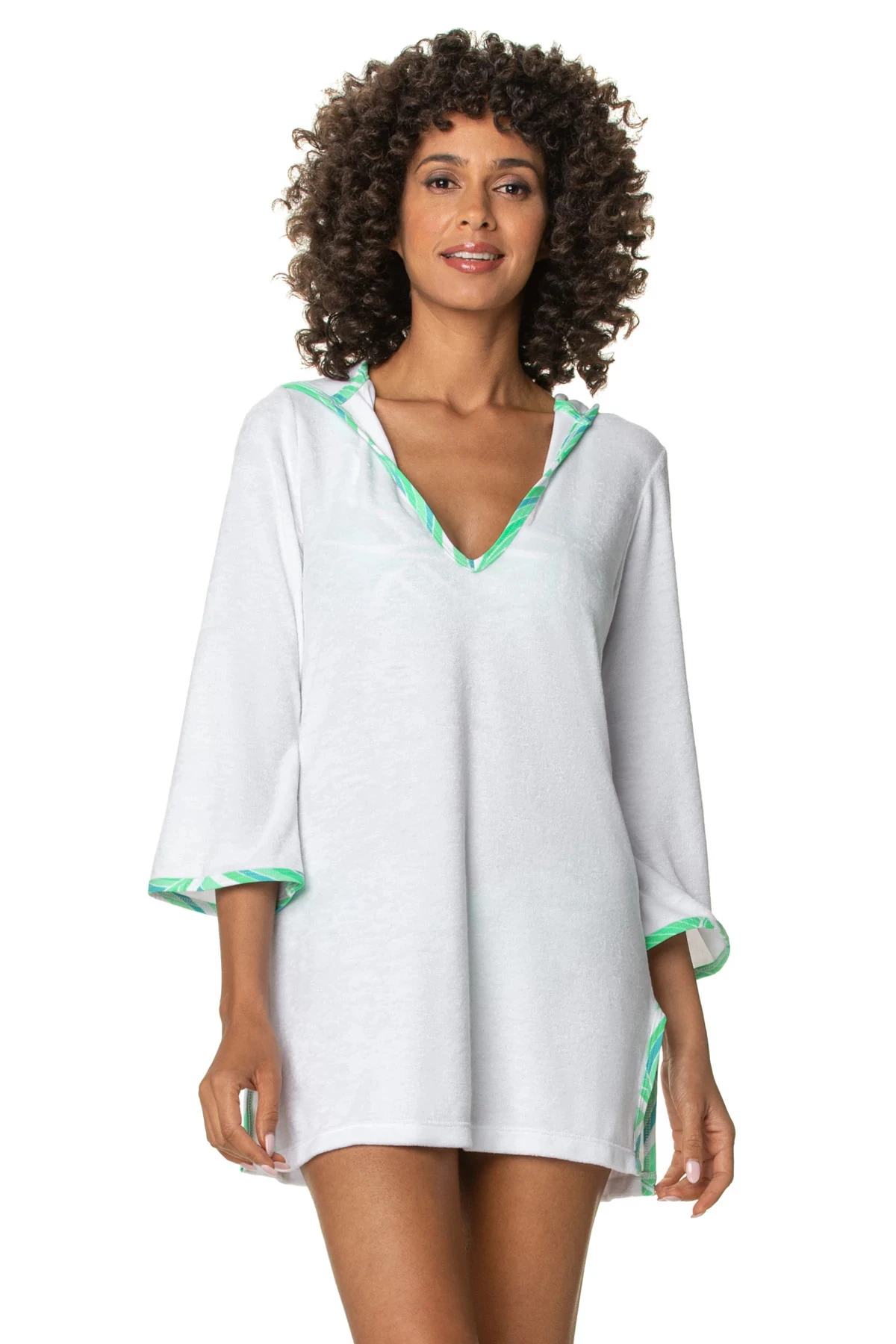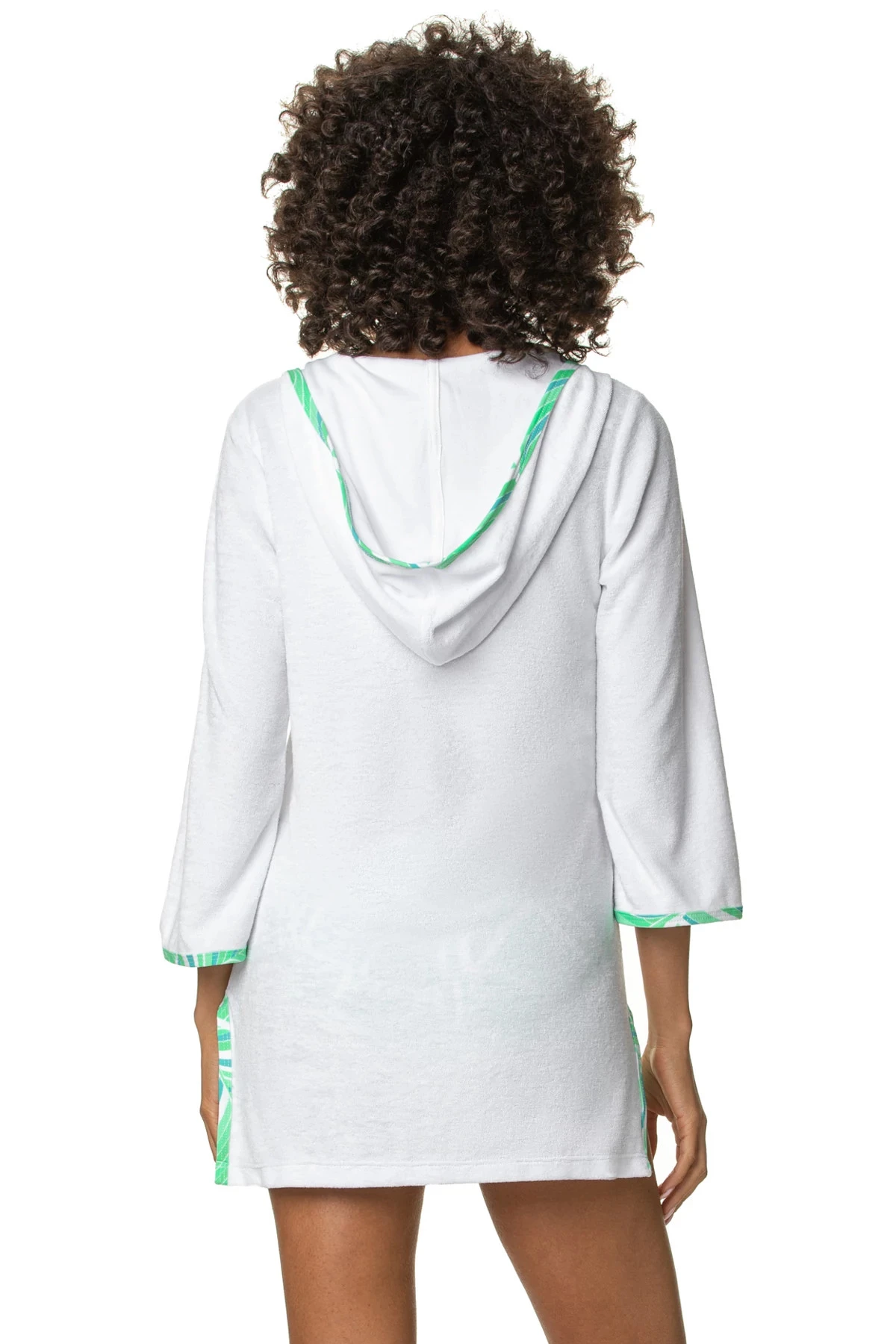 Hooded terry tunic features three quarter length sleeves, side vents, and a printed contrast on the hood, vents, and neckline.