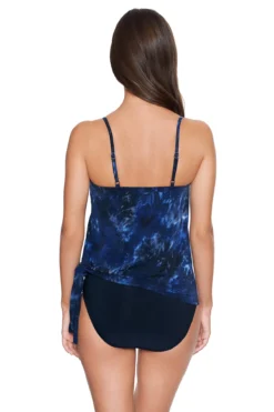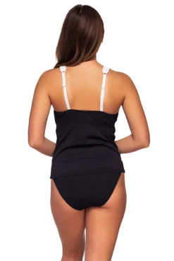 Chanae tankini top features a high neckline with a gold chain accent and offers removable soft cups.