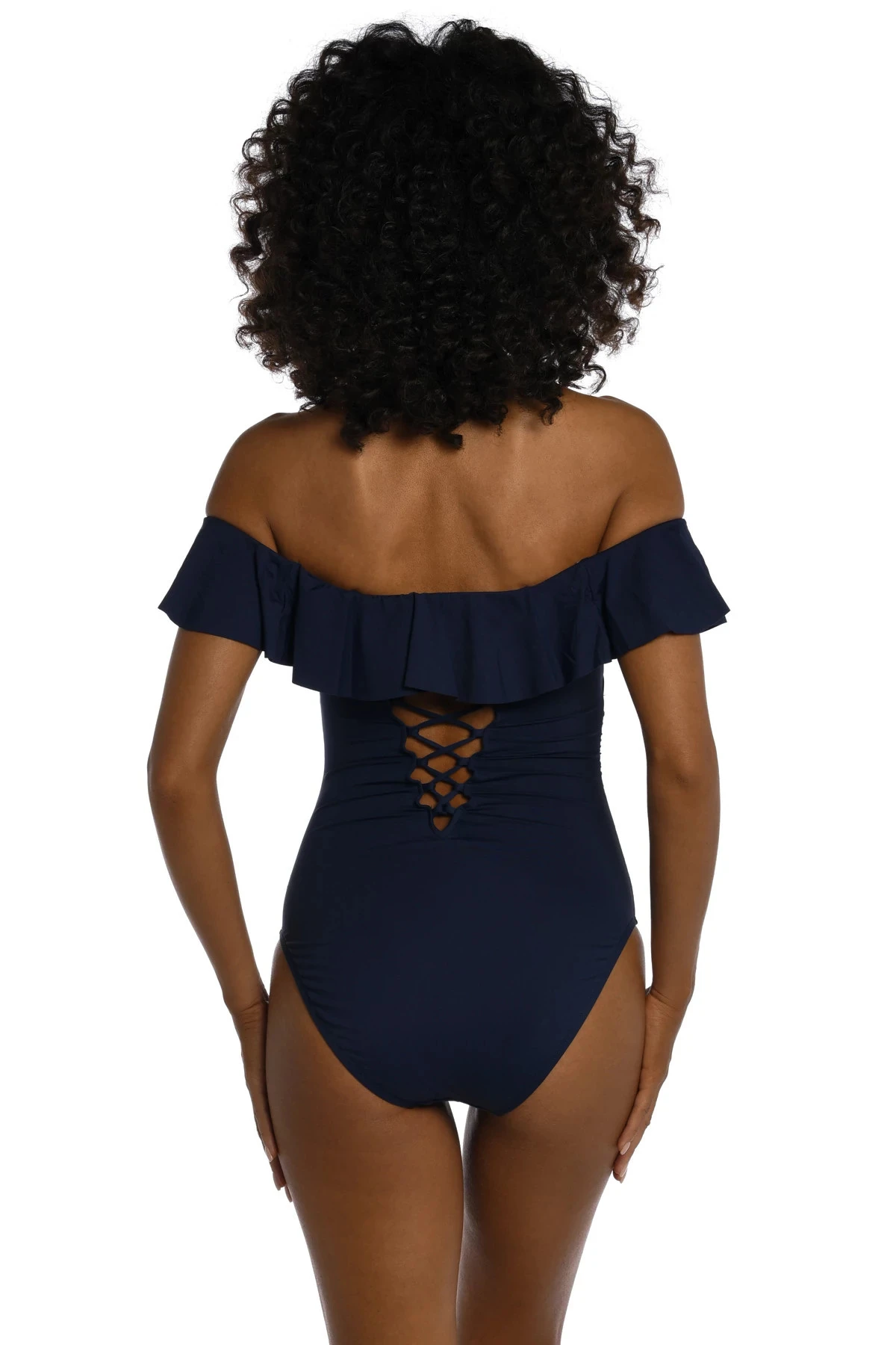 One piece bandeau swimsuit features off the shoulder flounce and criss cross back detail with removable soft cups, and tummy toner.