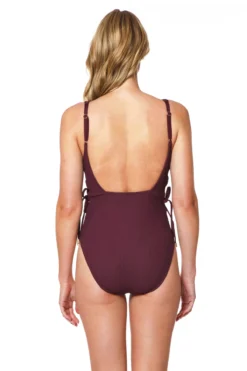The Jane One Piece is supportive and chic at the same time. Featuring an underwire, removable cups and a unique back detail. Adjustable straps with a j-hook that enable the straps to convert to a cross back along with a back tie so you’re sure to get the perfect fit. Also includes matching colored lining. Coverage: Moderate.