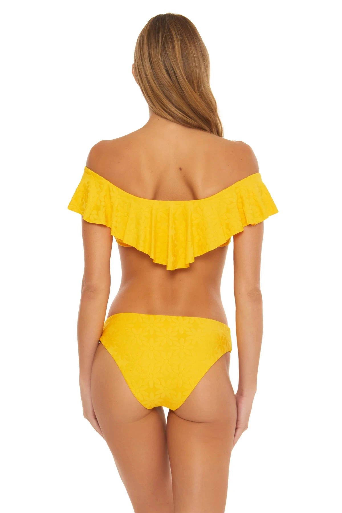 Joplin bandeau bikini top features a jacquard daisy texture and offers off-shoulder sleeves with a ruffle overlay and pullover fit.