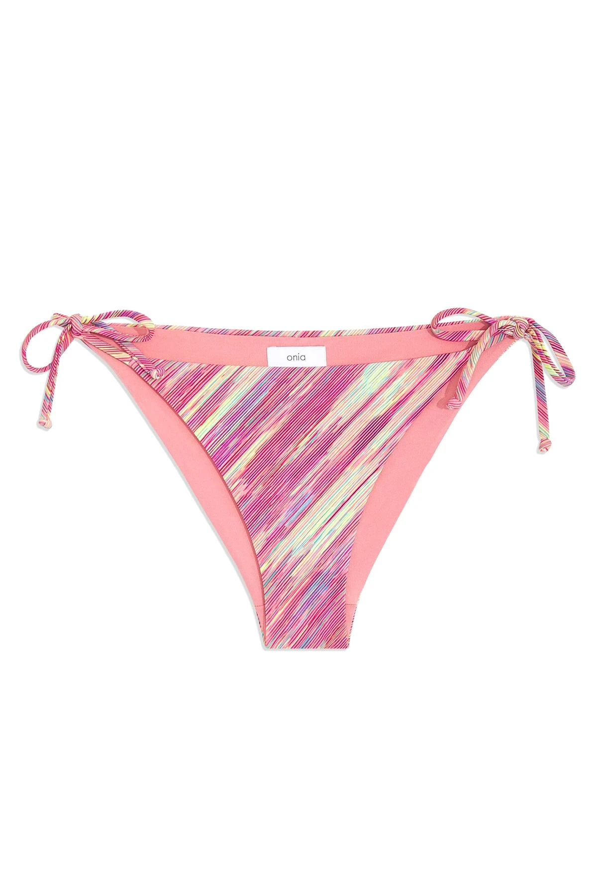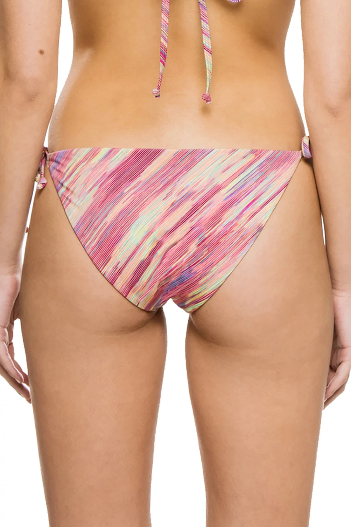 Kate hipster bikini bottom features a space dye fabrication and offers adjustable ties at hips and moderate coverage.