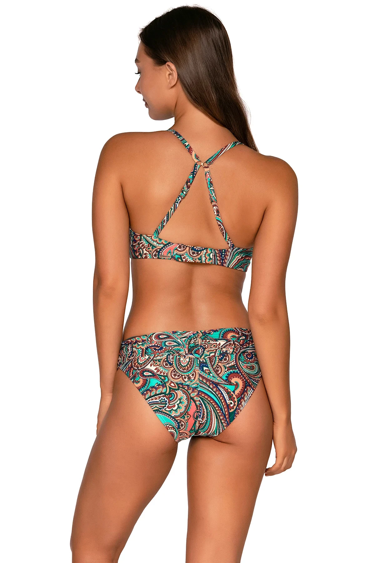 The Kauai top is designed with a keyhole for adjustable coverage. Also featuring an underwire, removable cups for support, adjustable straps with a j-hook and a hidden bra back closure.