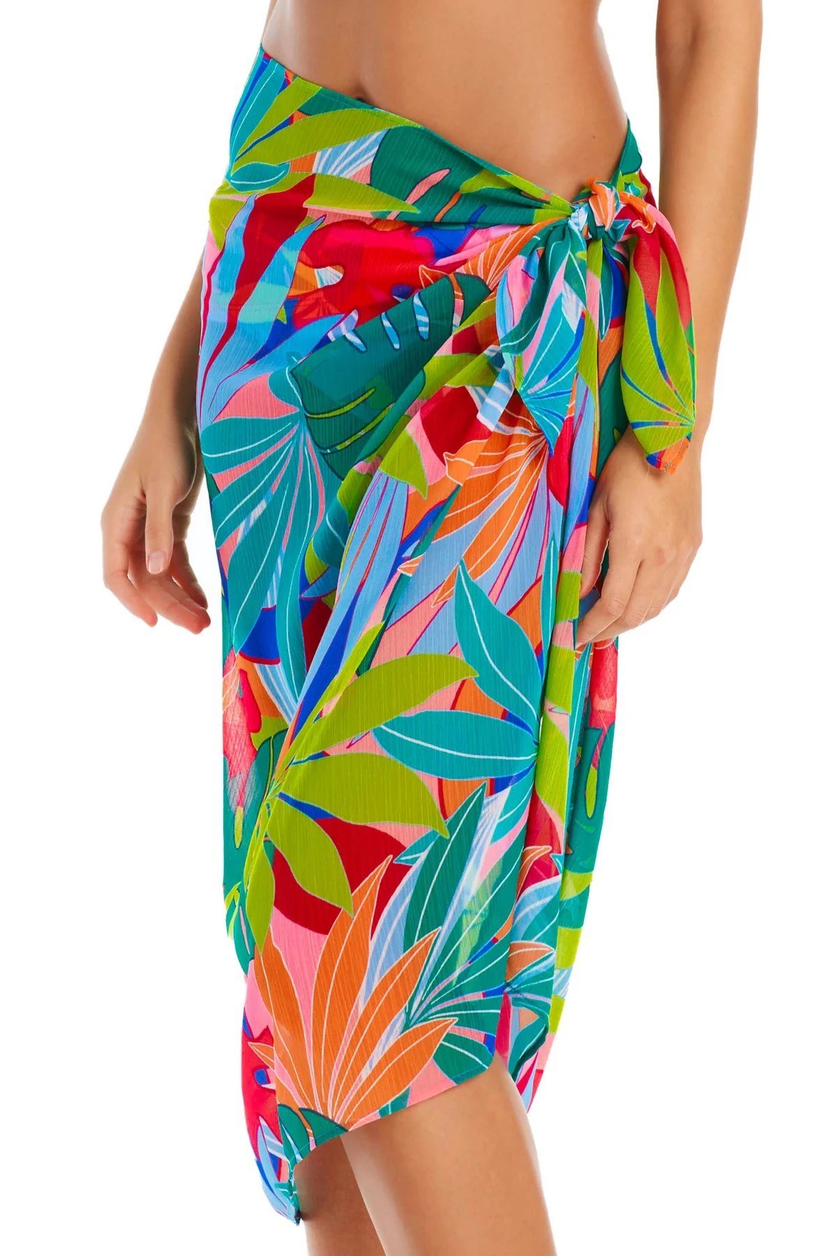 Sarong features a vibrant tropical print and offers an adjustable side tie.