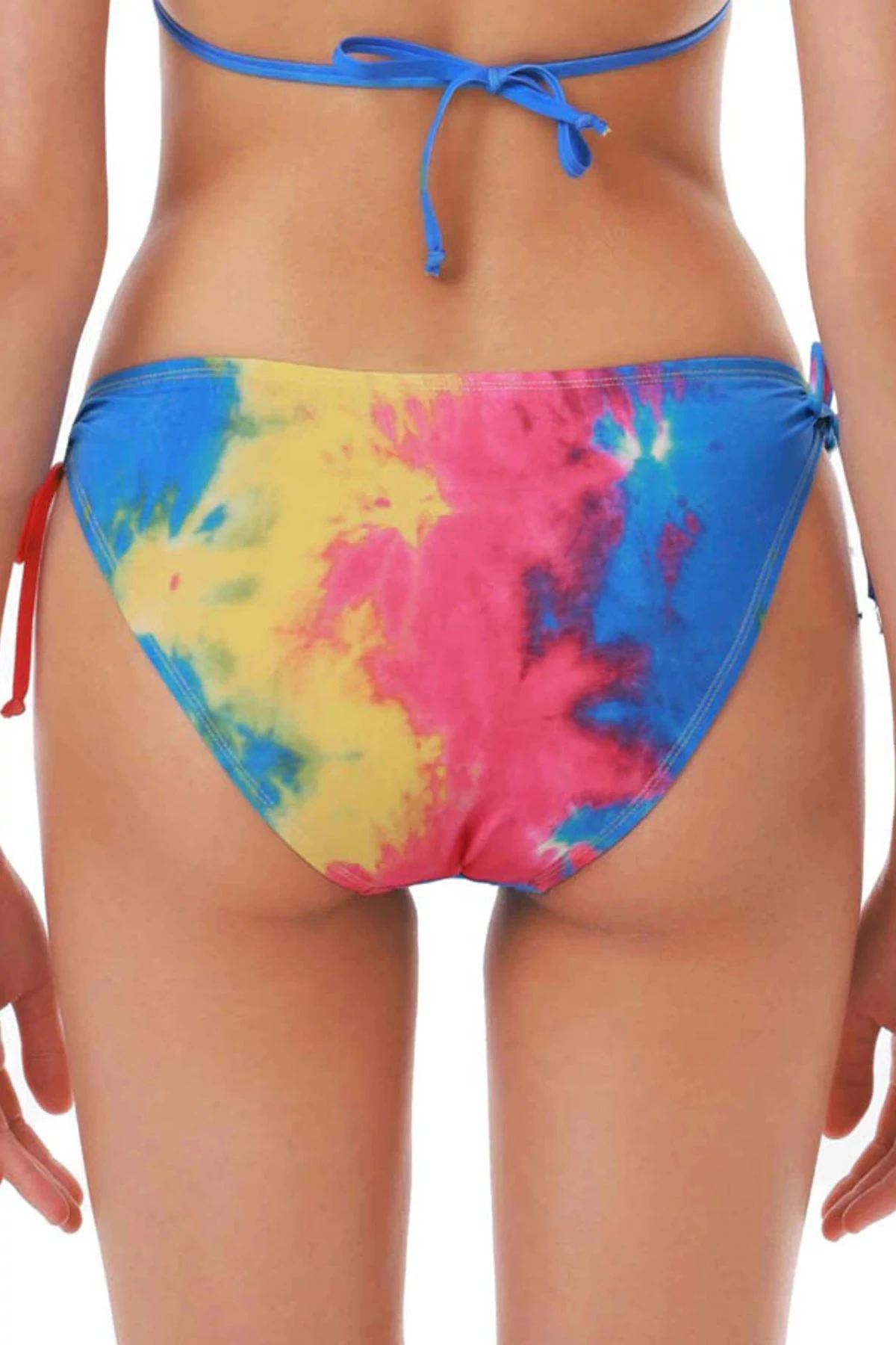 Hipster bikini bottom features a tie-dye fabrication and offers adjustable loop ties at hips and moderate back coverage.