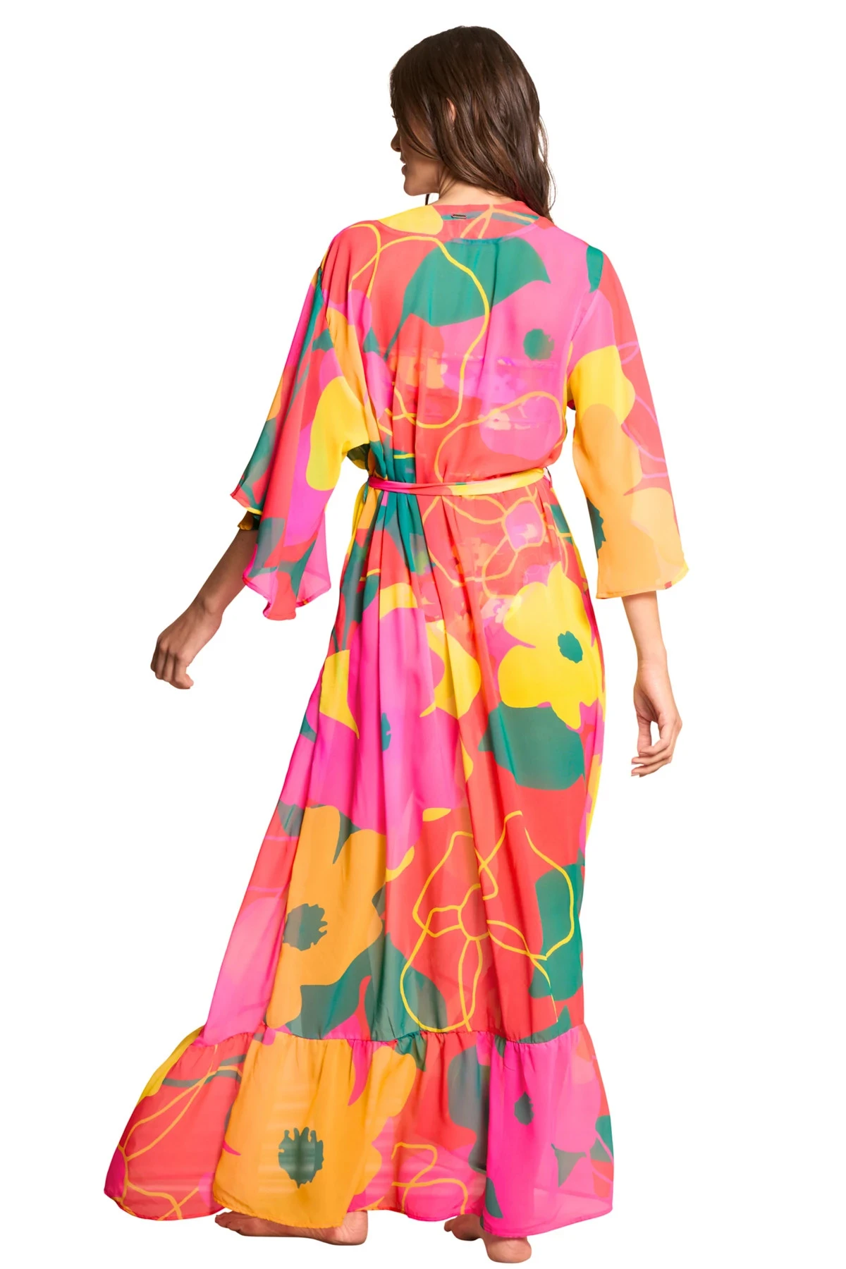 Crayonflower Tariah kimono features a bright floral print with three-quarter flutter sleeves and an open front offers ties at waist.