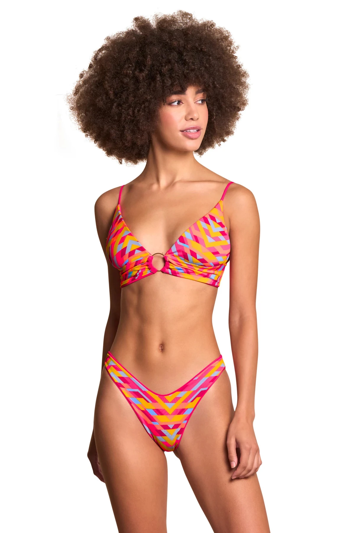 Shine bralette bikini top reverses to a vibrant print and features removable cups and a center ring detail. Offers loop through straps that tie at back.