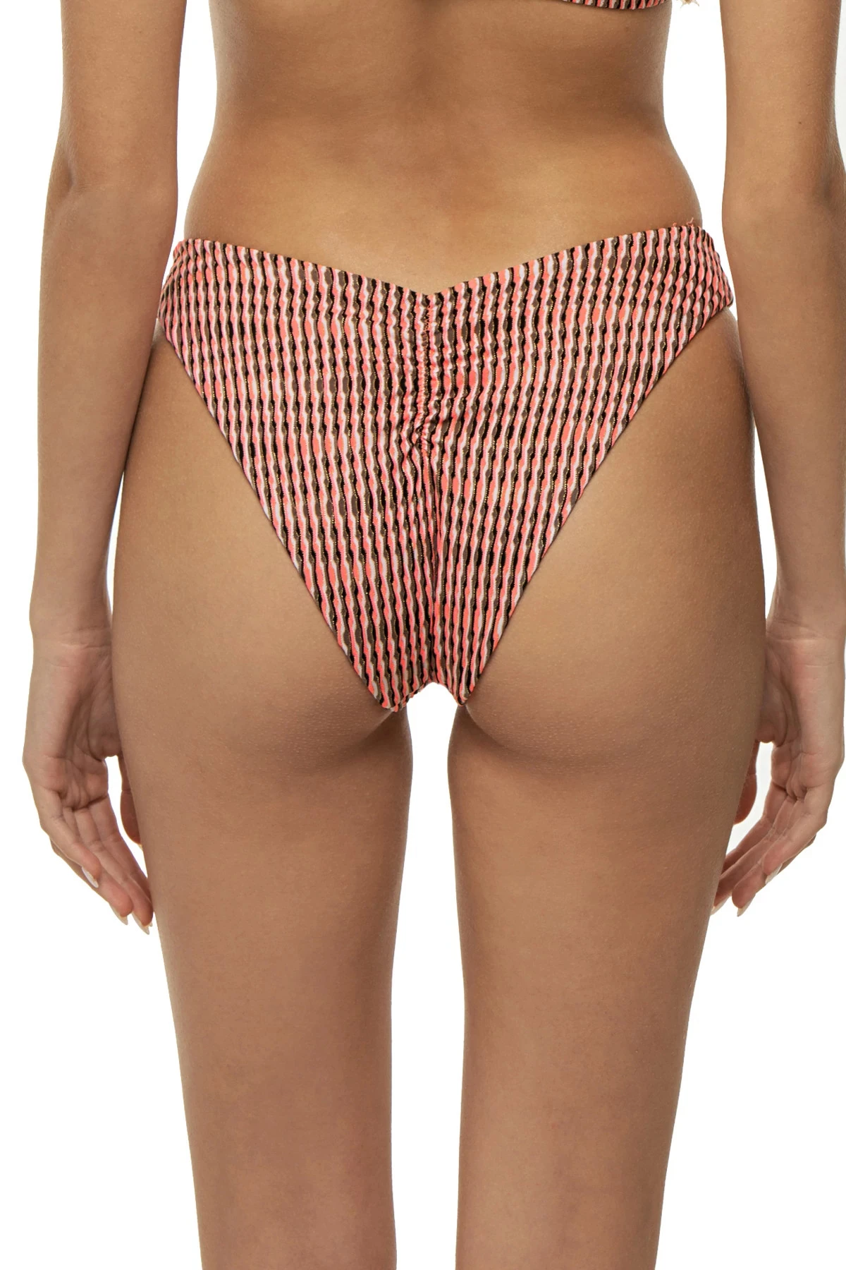 Malibu brazilian bikini bottom features a lurex stripe pucker fabric and offers a high leg cut, v-front and back, with minimal bottom coverage.